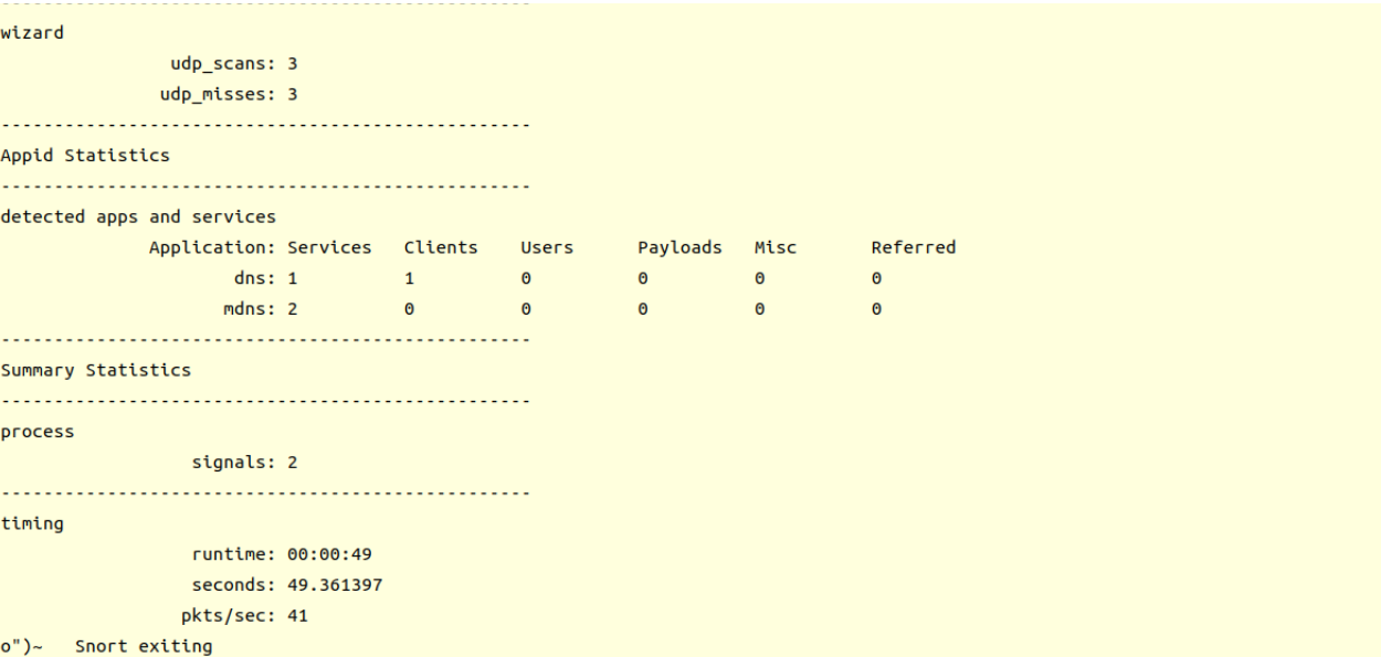 - timing: Snort的运行时间位49秒、处理的数据包速率为41。