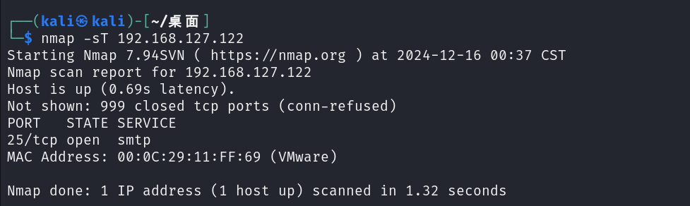 由于snort设置的是监测TCP的规则,因此可以使用TCP Connection扫描(TCP全扫描,该技术完成TCP三次握手)。