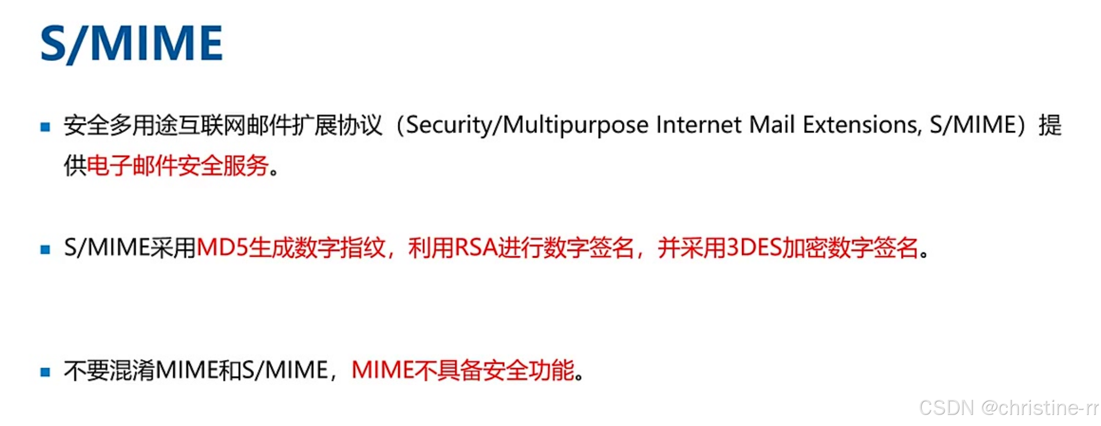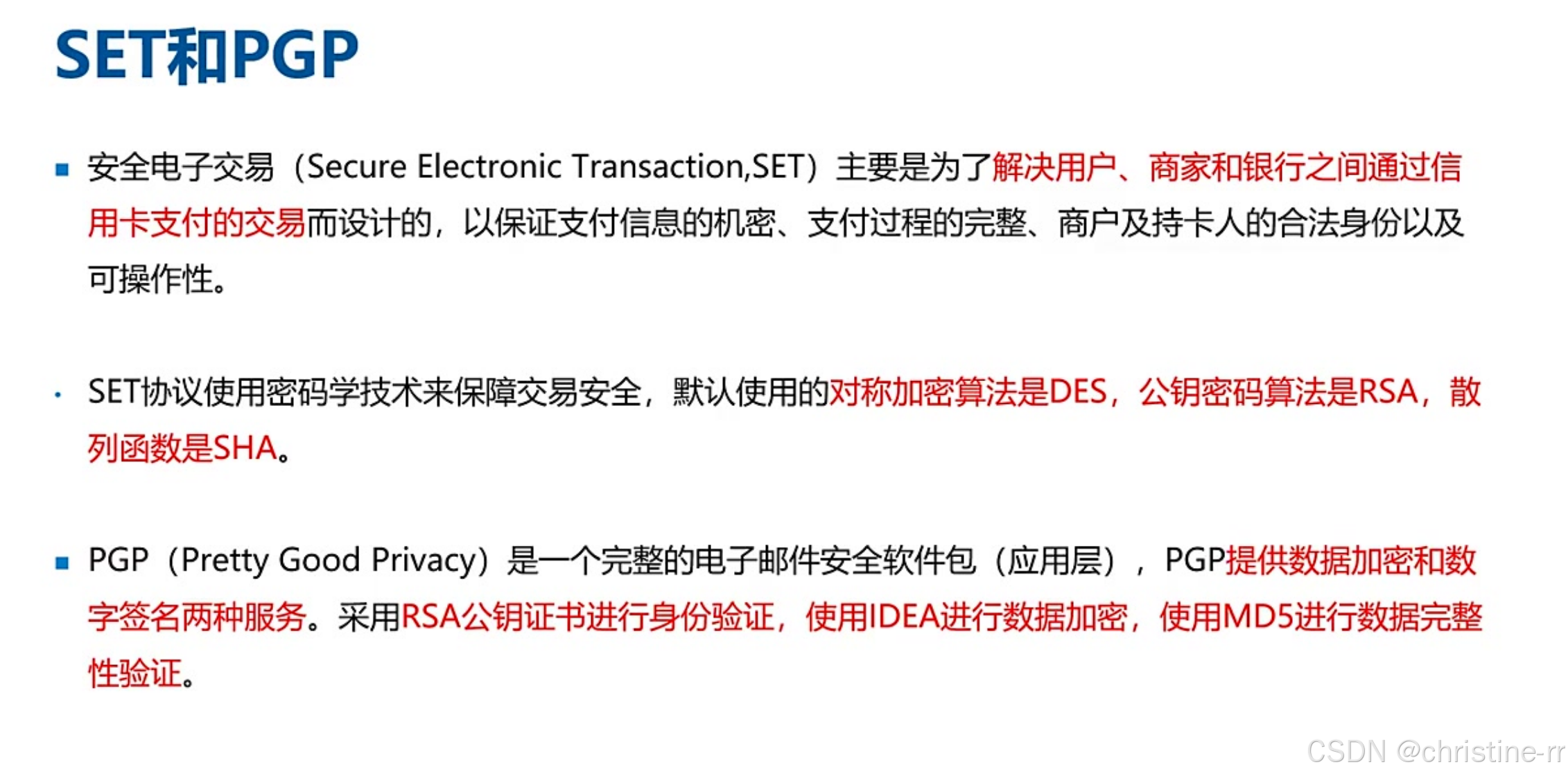 PGP/SET/S-MIME | PGP:邮件安全(RSA签名、IDEA加密、MD5校验)。 SET:电子交易(DES加密、RSA公钥、SHA哈希)。 S-MIME:安全邮件扩展(MD5/RSA/3DES)。 | 考试重点: - PGP功能(加密/签名/校验,不含压缩)。 - 各协议算法差异。 | ⭐⭐⭐ |