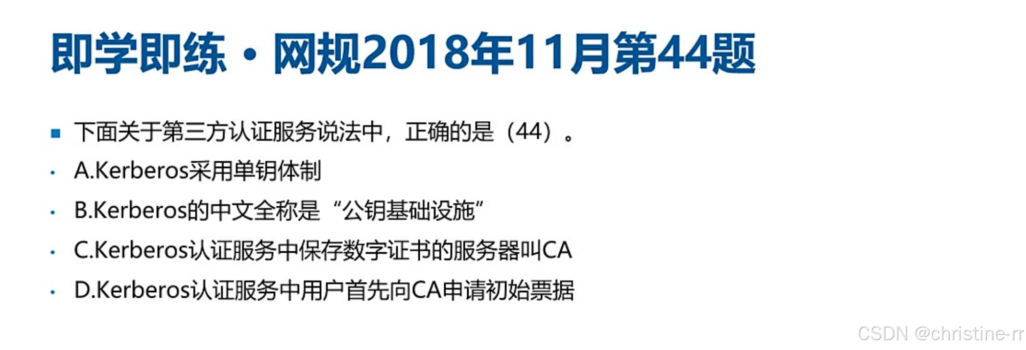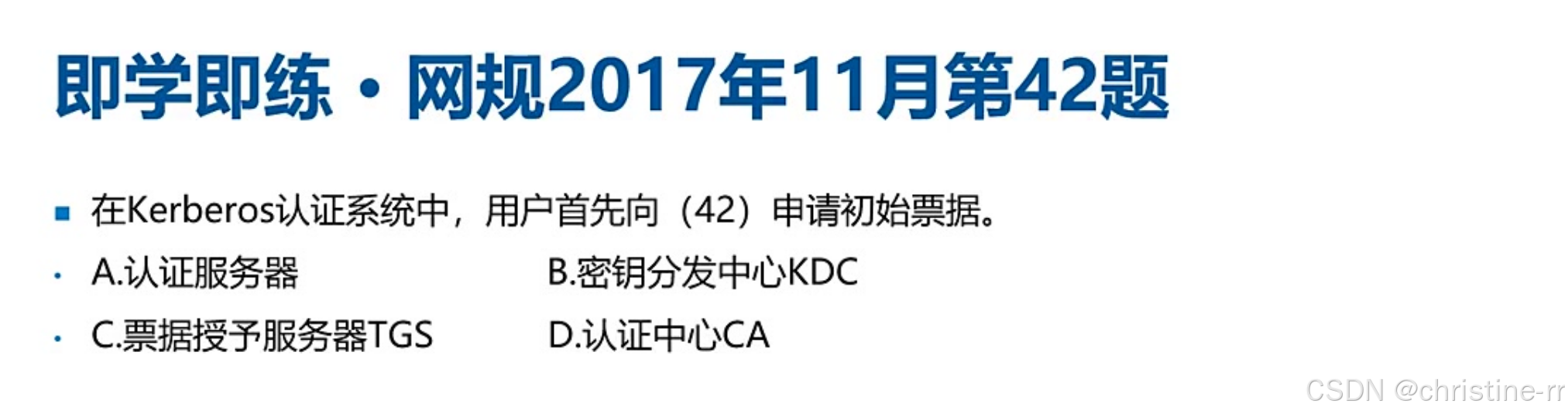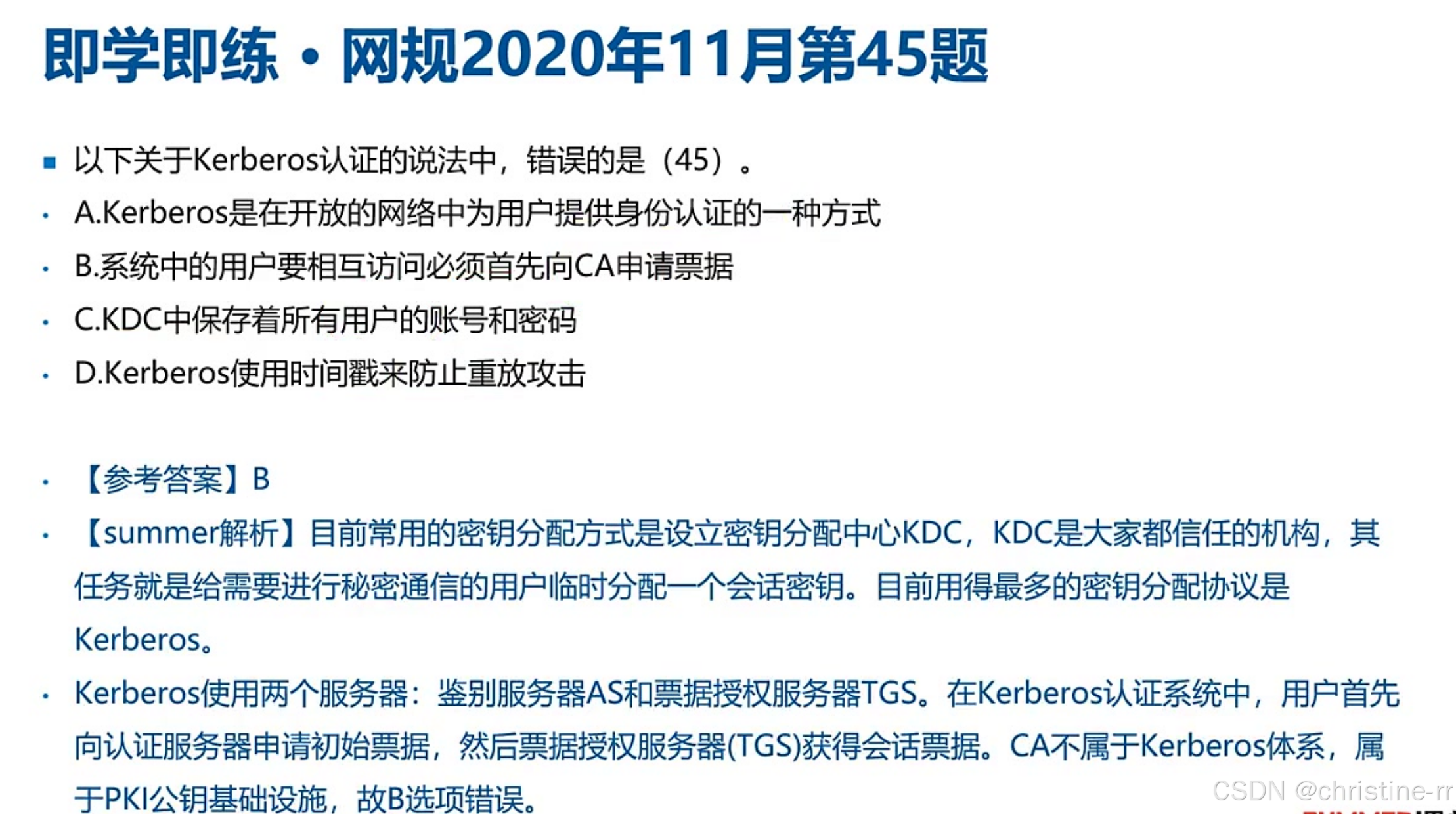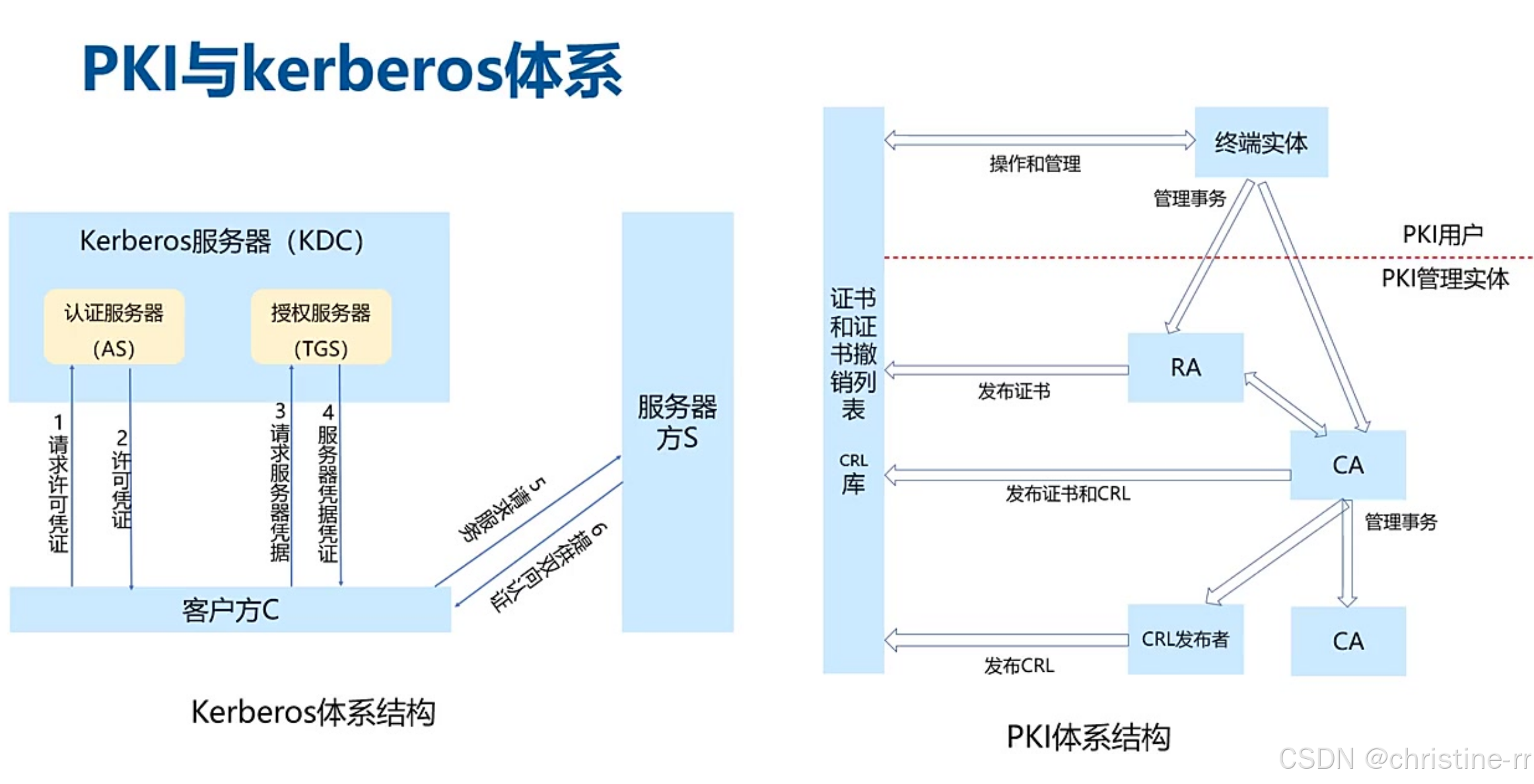 PKI vs Kerberos | PKI:CA/RA/证书,用于公钥分发。 Kerberos:KDC(含AS和TGS)、票据(Ticket),用于身份认证。 | 易混淆点: - PKI用证书,Kerberos用票据。 - CA≠KDC,AS/TGS属于Kerberos体系。 | ⭐⭐⭐⭐ |