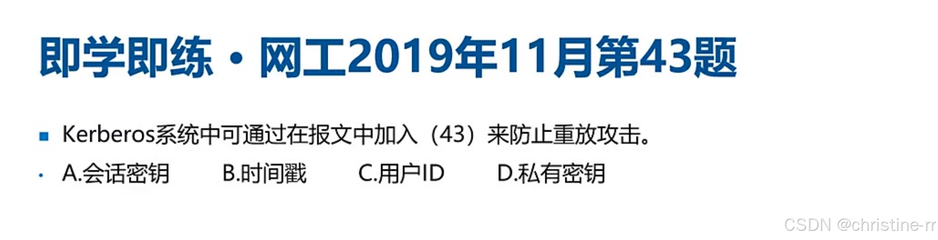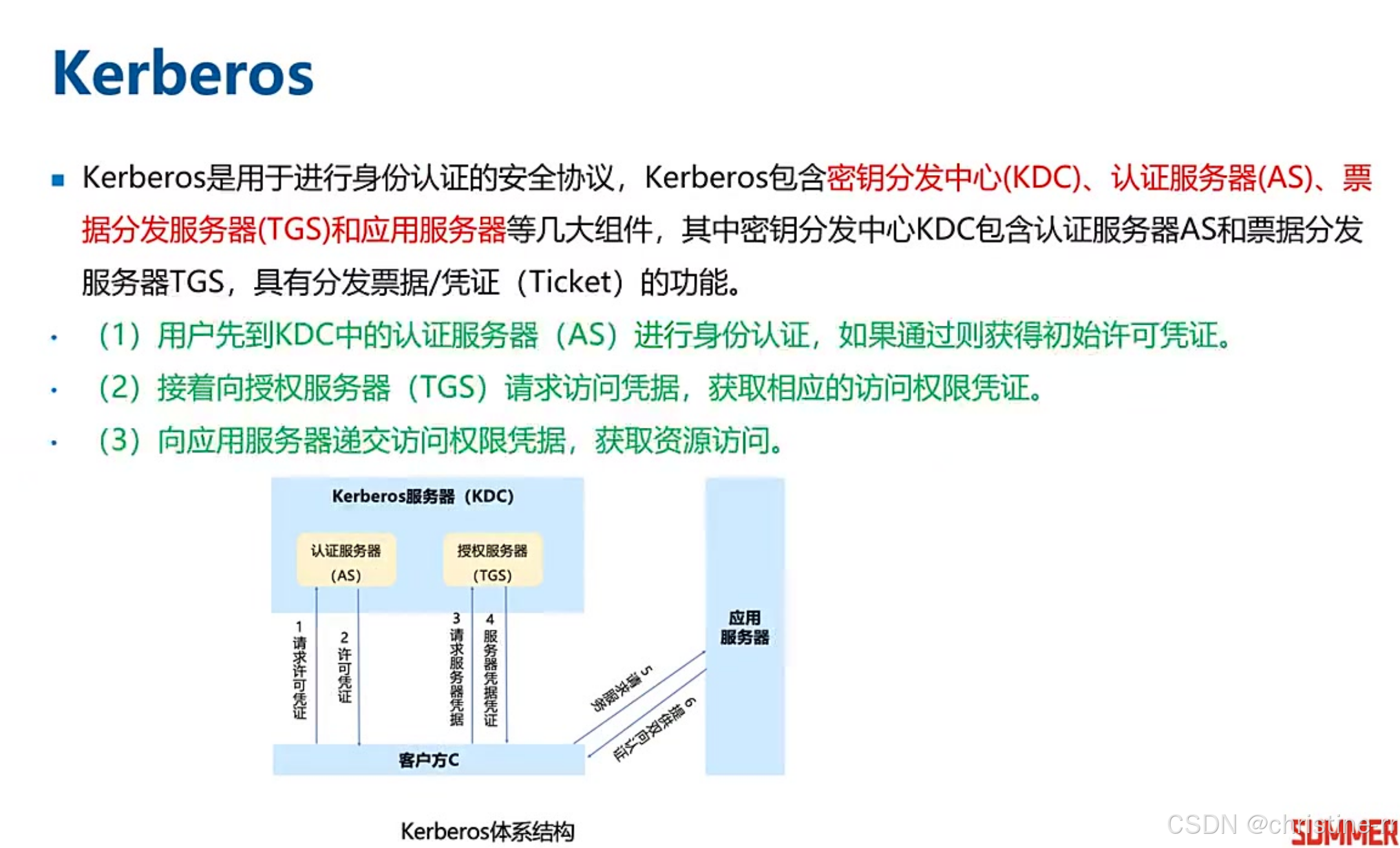 Kerberos流程 | 1. 用户→AS认证→初始票据; 2. 用户→TGS→访问凭证; 3. 用户→应用服务器(凭票据访问)。 | 核心组件:AS(认证)、TGS(授权)、KDC(密钥分发中心)。 防重放攻击:时间戳/随机数。 | ⭐⭐⭐ |