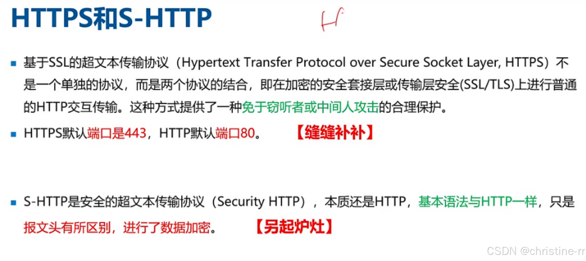 S-HTTP | 安全的HTTP协议(另起炉灶开发),端口仍为80,但未广泛应用。 | 与HTTPS区别: - HTTPS是HTTP+SSL补丁,S-HTTP是独立协议。 - 考试易混淆:哪种更常用?(HTTPS) | ⭐⭐ |