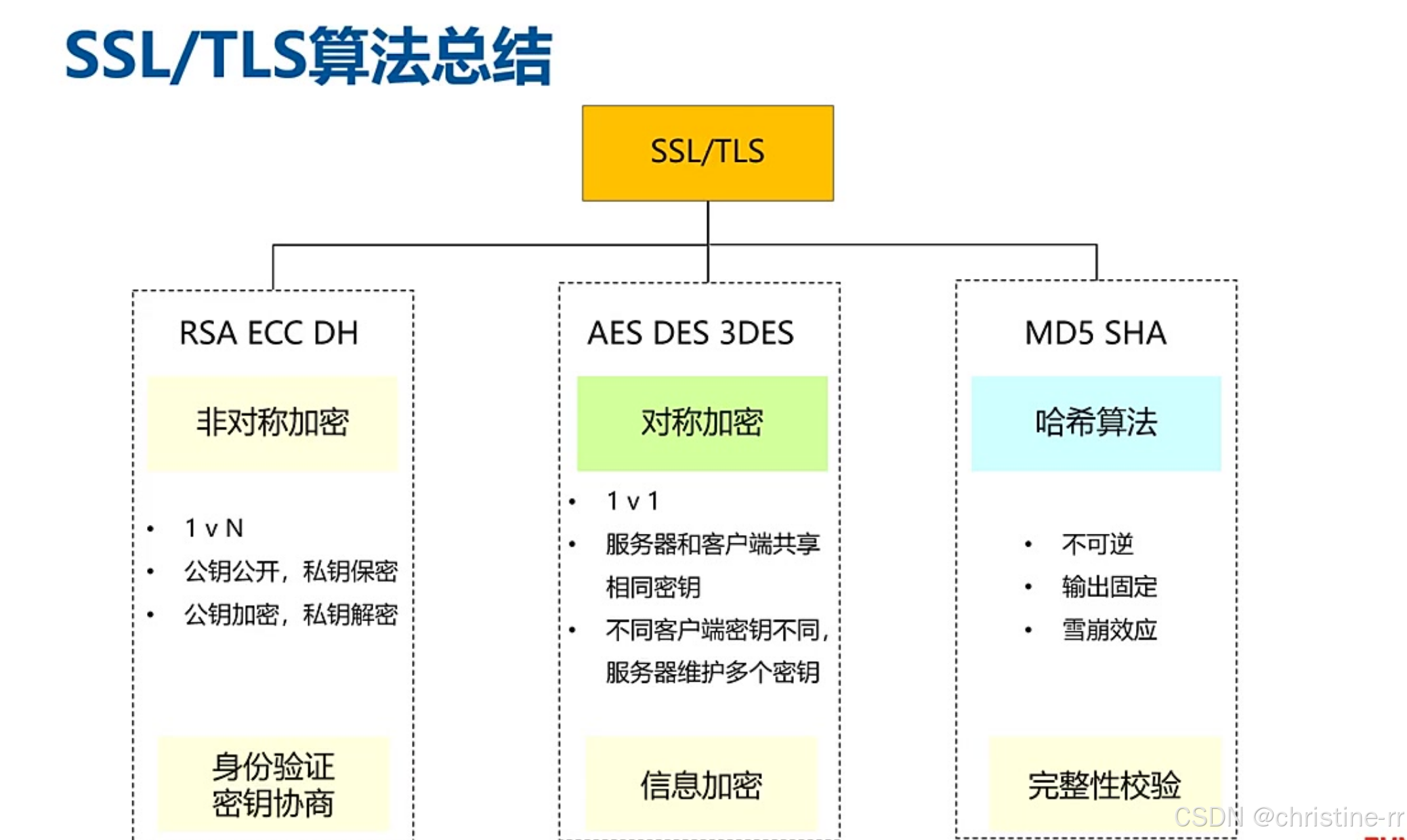 SSL/TLS算法应用 | 对称加密(AES/3DES)→加密数据。 非对称加密(RSA/DH)→密钥交换。 哈希算法(SHA/MD5)→完整性校验。 | 易错点: - 非对称加密不用于加密大数据(速度慢/膨胀)。 | ⭐⭐⭐ |