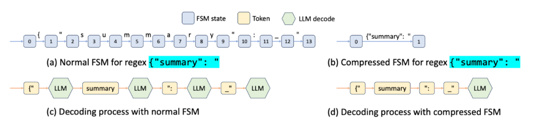 {"title": "SGLang"}与当前压缩边文本{"summary": "AI is整合,得到完整上下文字符串:{"title": "SGLang"}{"summary": "AI is。{"、title、": "、SGLang、"}、{"、summary、": "、AI、 is{"、summary、": "、AI、 is),结合FSM可以一次性的将5个token输入大模型,进行后续解码。对跳转机制的解释:输入边上的长字符被重新拆分为多个token,在解码时候遇到特定的字符(长字符的部分子串),可以一次性的将长字符的所有token组成输入到大模型,进行下一次的预测,进而达到 “跳跃” 的效果。