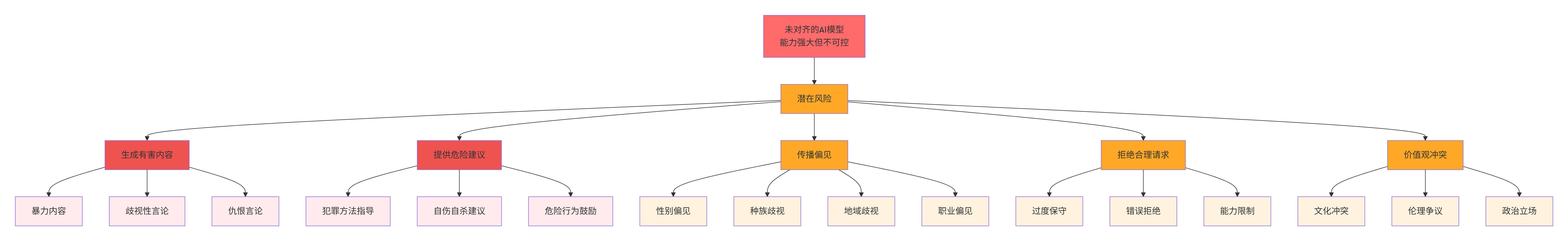 这个流程图清晰地展示了未对齐AI模型可能带来的各种风险: