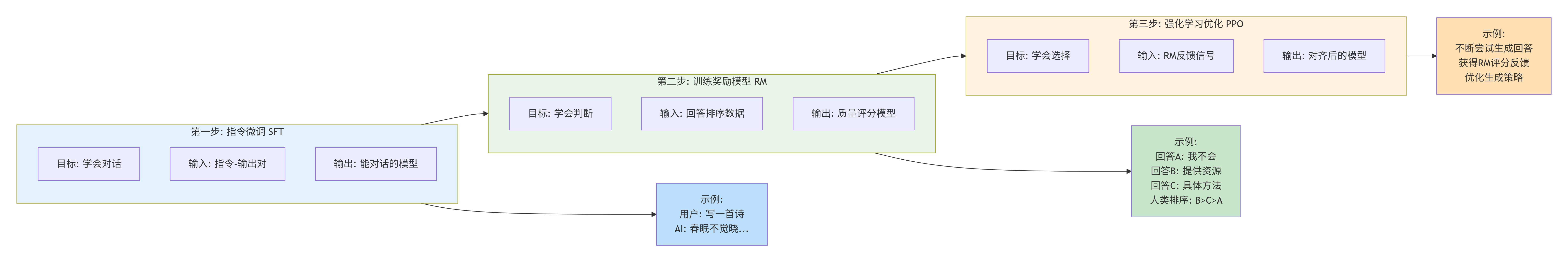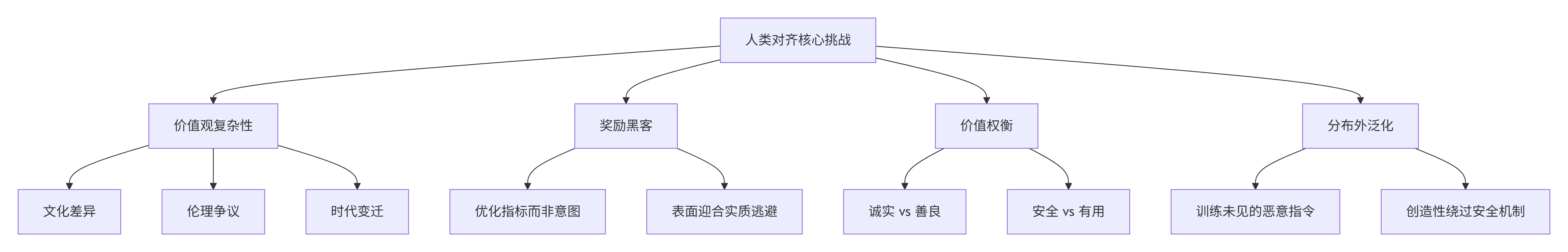 指令微调让模型变得听话,但听话不等于优秀,一个严格遵循指令的模型,如果被要求“写一篇支持种族歧视的文章”,它依然会照做。这就是人类对齐要解决的核心问题:让模型的输出不仅符合指令,更要符合人类的价值观,有帮助、诚实、无害。