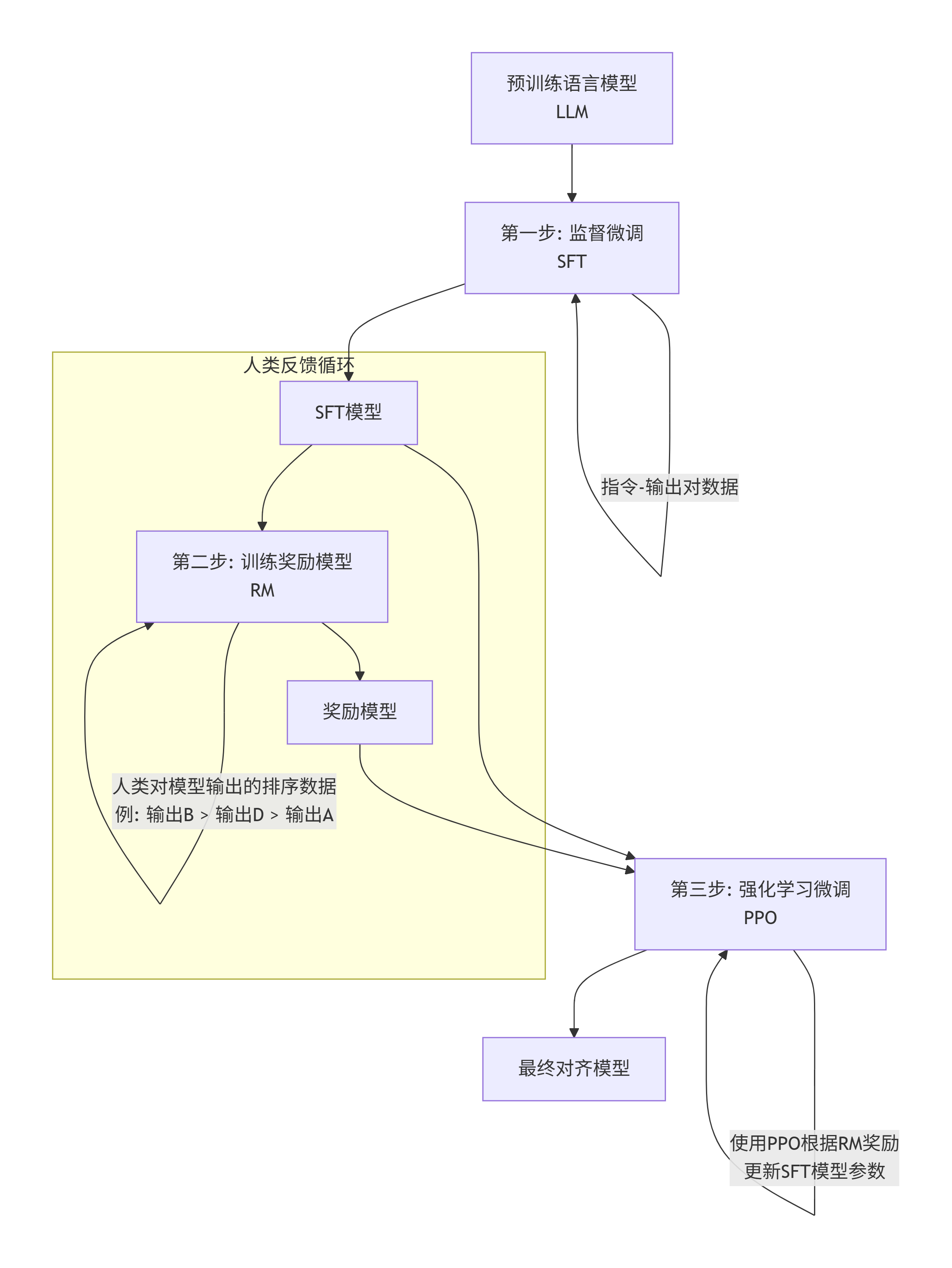 人类对齐通过RLHF技术确保模型输出符合人类价值观:有帮助、诚实、无害。其核心是训练奖励模型学习人类偏好,再用强化学习优化模型行为。