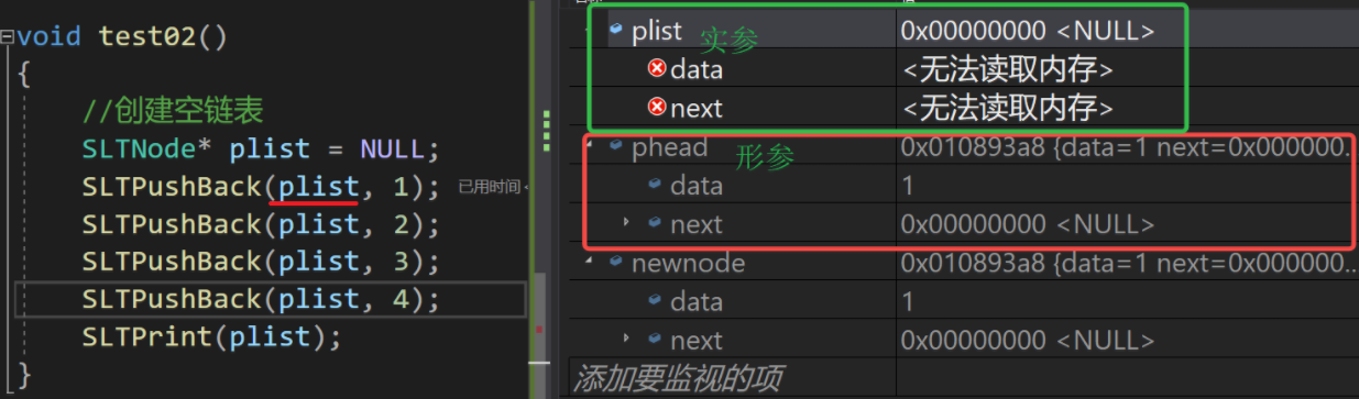 首先我们需要思考一下,在给SLTPushBack函数传参时,我们需要传递的结点指针是一级指针还是二级指针呢? 我们需要明确:链表结点结构体所包含的其中一个成员是指向下一个结点的指针,即一级指针,我们在尾插时需要改变这一指针指向的地址,因此需要给尾插函数传递一个实参而不能传递形参。所以我们所以我们需要传递的是一个指向指针的指针,即二级指针。 事实上,如果我们传递的是一级指针,会出现如下的错误:
