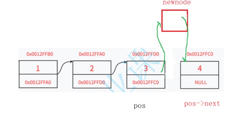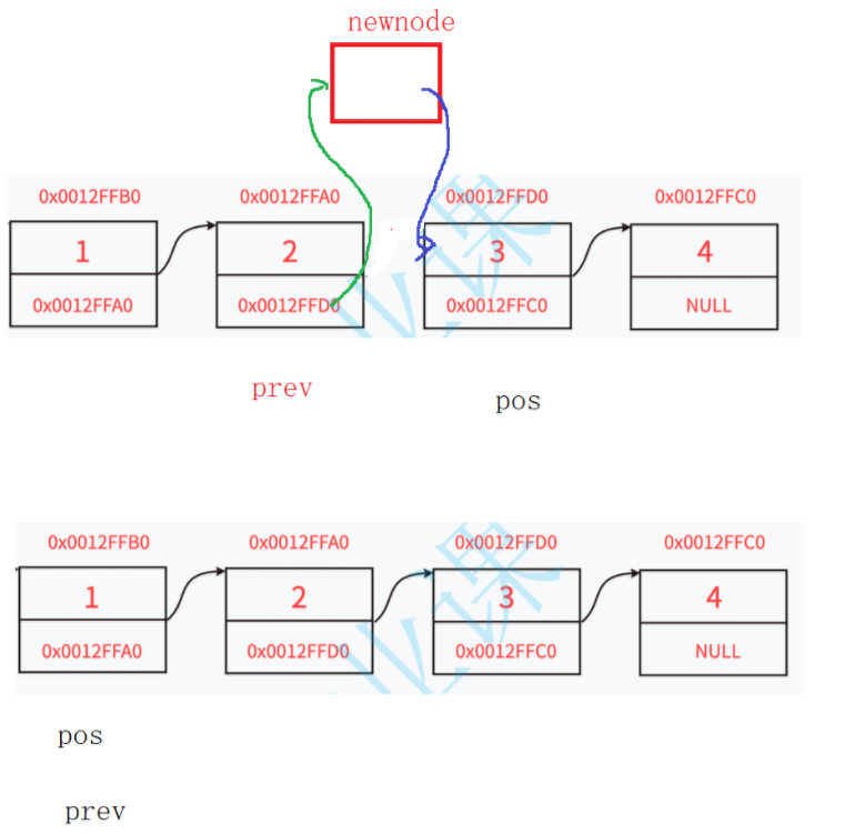 }当在中间结点前插入(一般情况)时,我们先遍历链表找到 pos 结点的前驱节点 prev,将prev 的 next 指针指向新结点,最后将新结点的 next 指针指向 pos 结点。如下: