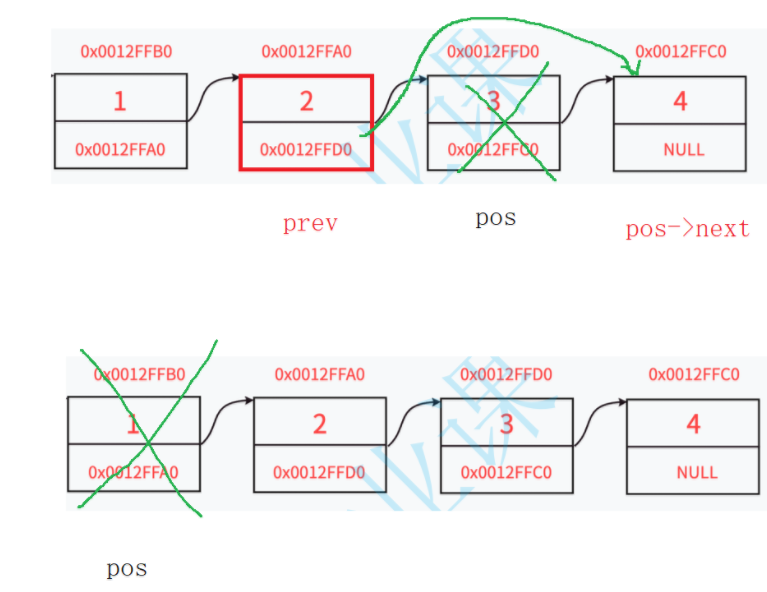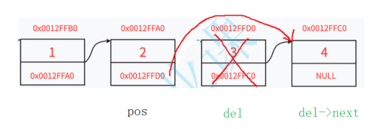 对于本函数,我们首先要保存删除的结点,将pos的下一个结点保存到临时变量 del 中。这个结点就是要被我们删除的结点。