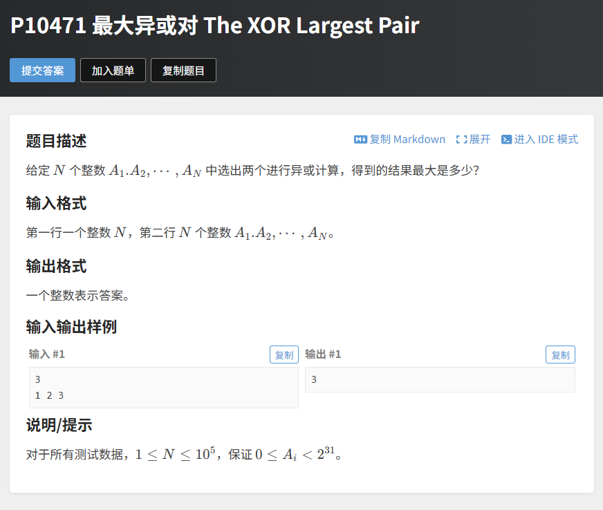 3解释:3(11)和 1(01)异或结果是 2(10),3 和 2(10)异或结果是 1(01),2 和 1 异或结果是 3(11),最大值为 3。