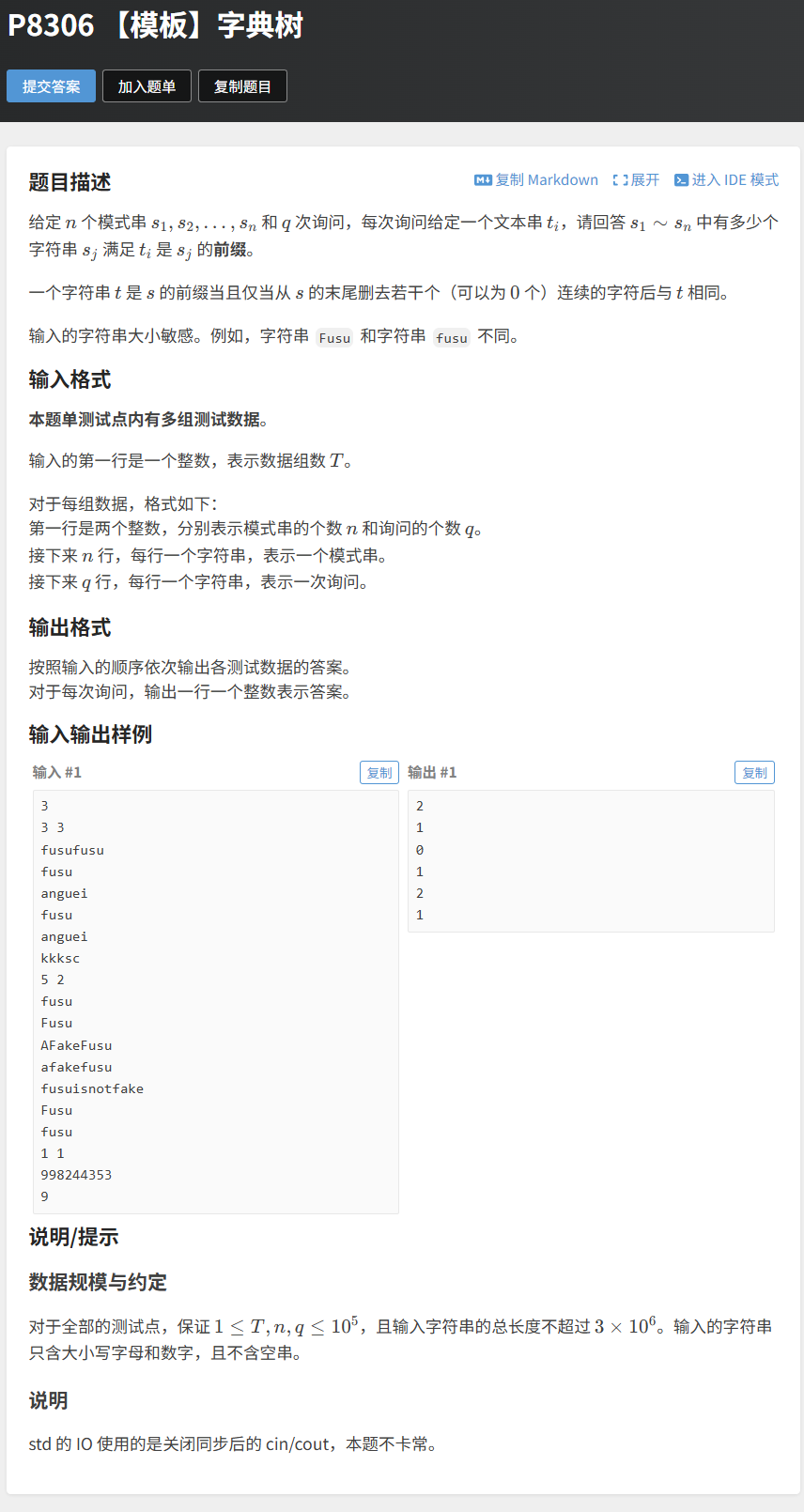 for (int i=0; i<=idx; i++) memset(tr[i], 0, sizeof tr[i])),避免memset整个大数组(效率低)。 当字符串数量或长度较大时(如 n=1e5、字符串长度 = 1e3),cin和cout的默认速度会很慢,导致超时。