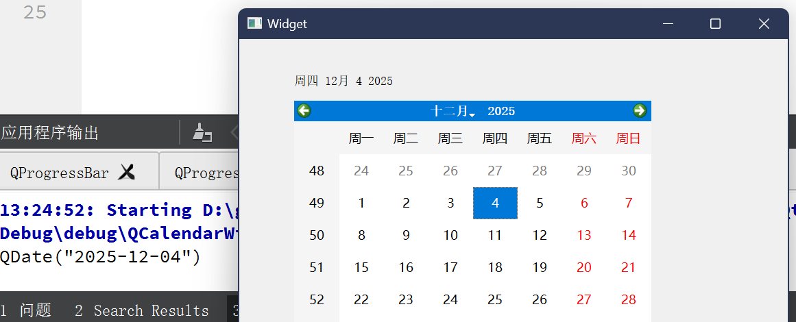 });qt_calendar_today);paintCell时未先调用QCalendarWidget::paintCell,覆盖了默认样式;paintCell时,先调用父类方法绘制默认样式,再绘制自定义内容。QDate::toString的格式符使用不当,默认根据系统 locale 显示;// 方式1:使用中文格式符(dddd显示中文星期)