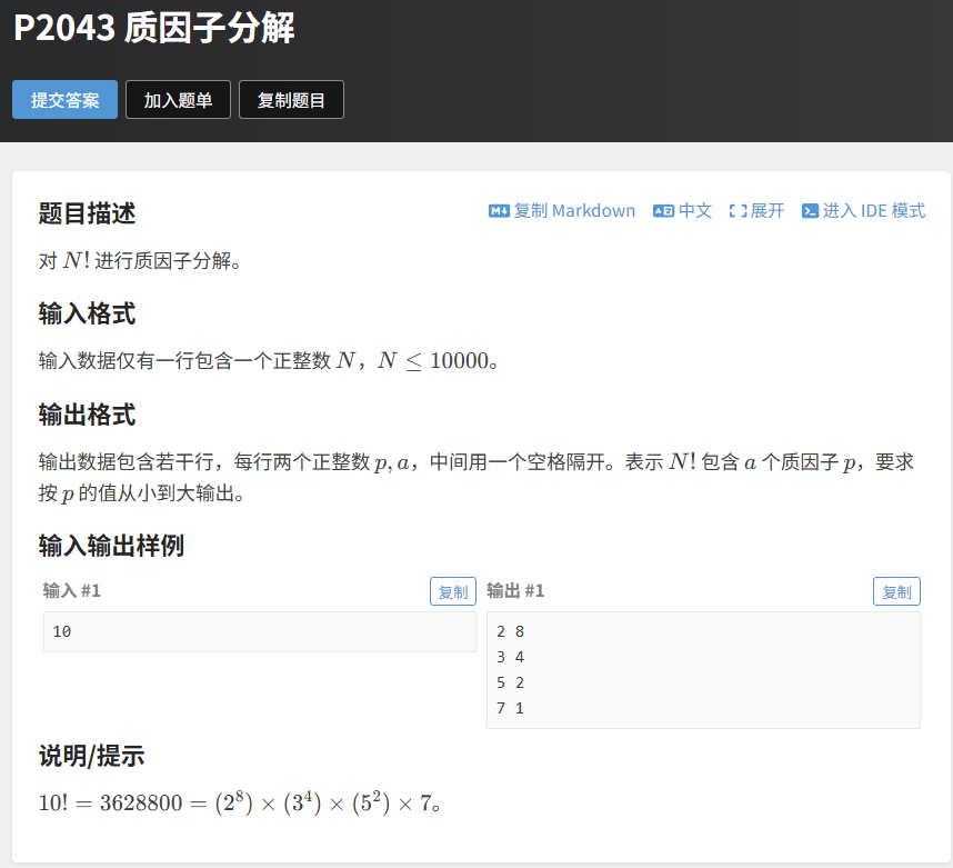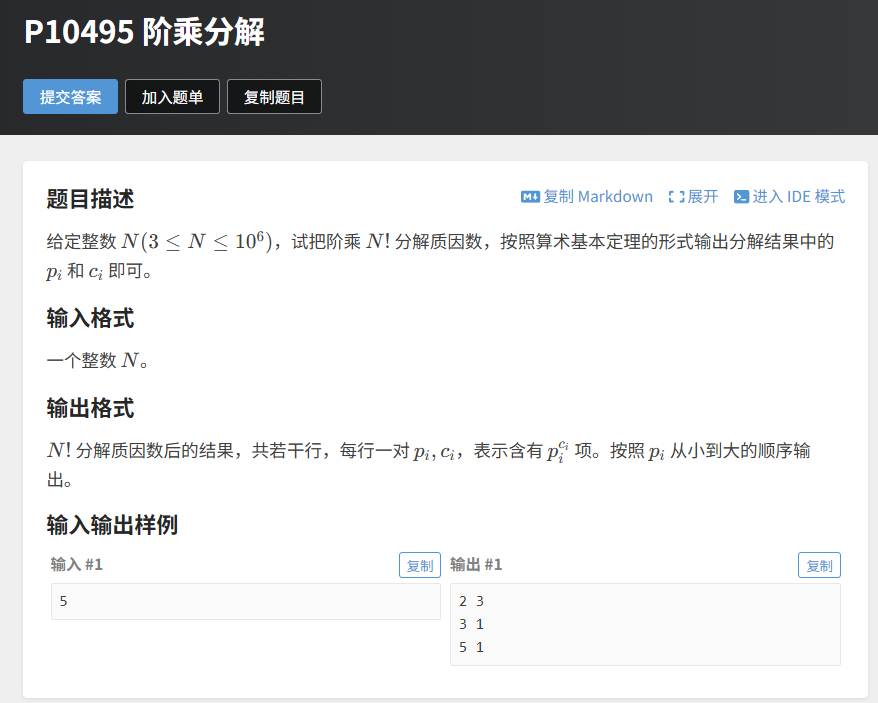 核心难点:N! = 1×2×3×…×N,直接计算 N! 再分解会导致数值溢出(1e4! 是一个极其庞大的数,远超出 long long 范围),因此必须找到更巧妙的方法。