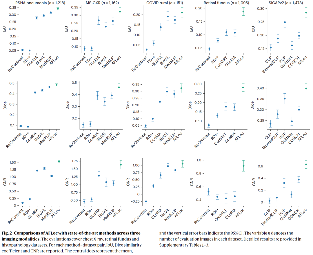 图 2|AFLoc 与现有先进方法在三种影像模态上的性能对比。