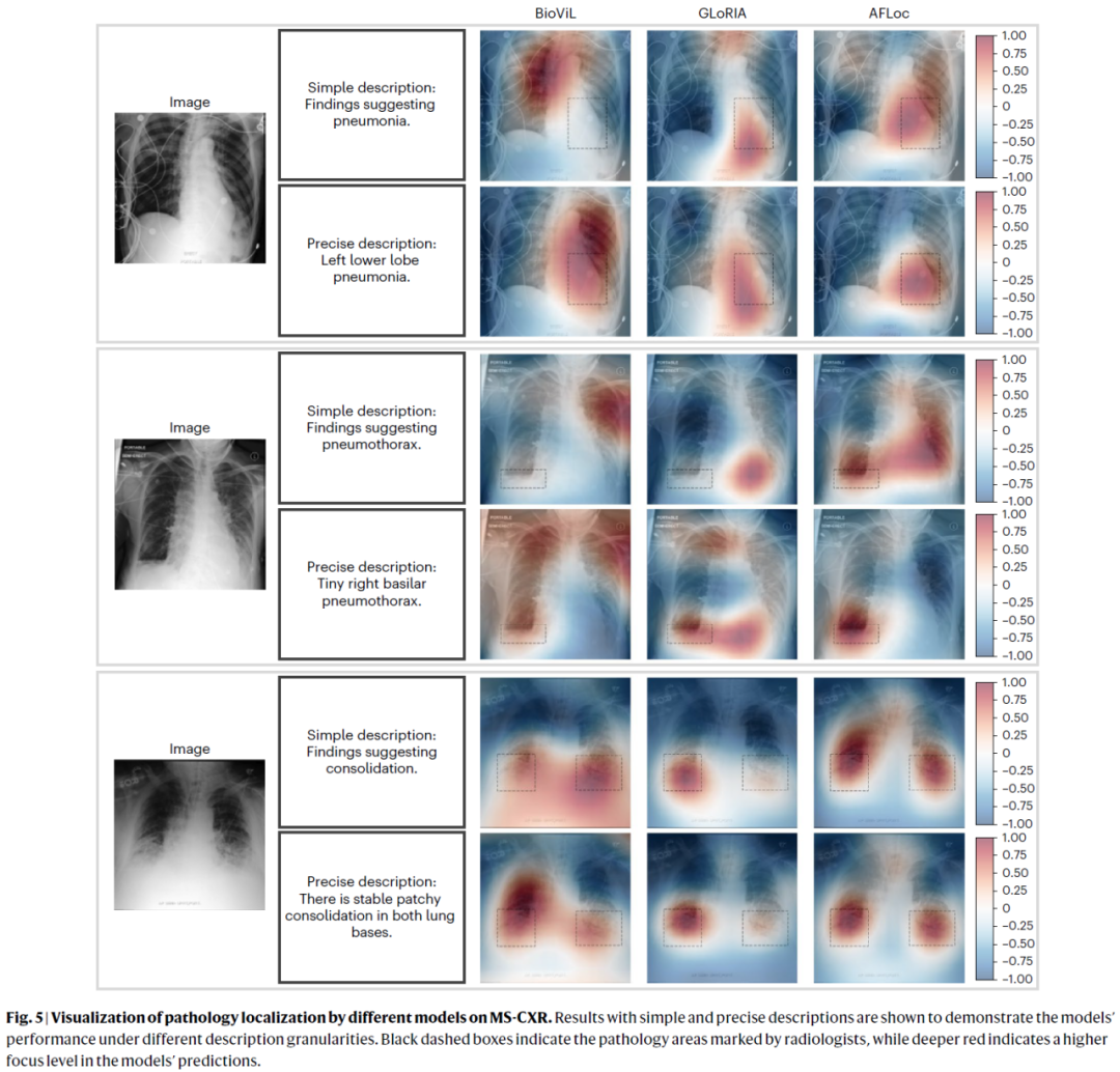 图 5|不同模型在 MS-CXR 数据集上的病理定位可视化对比。