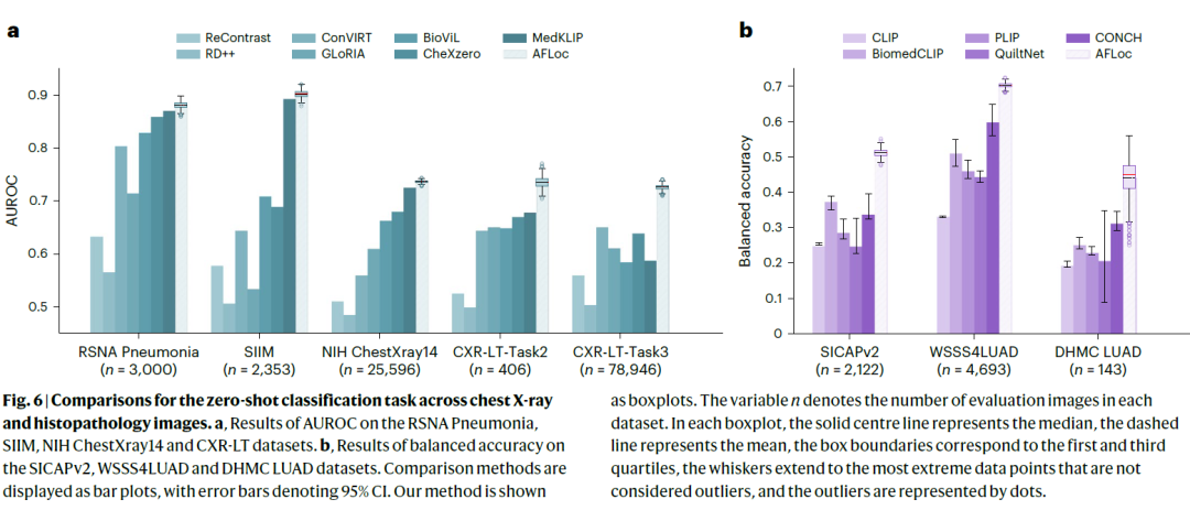 图 6|胸部 X 光与组织病理影像上的零样本分类任务性能对比。