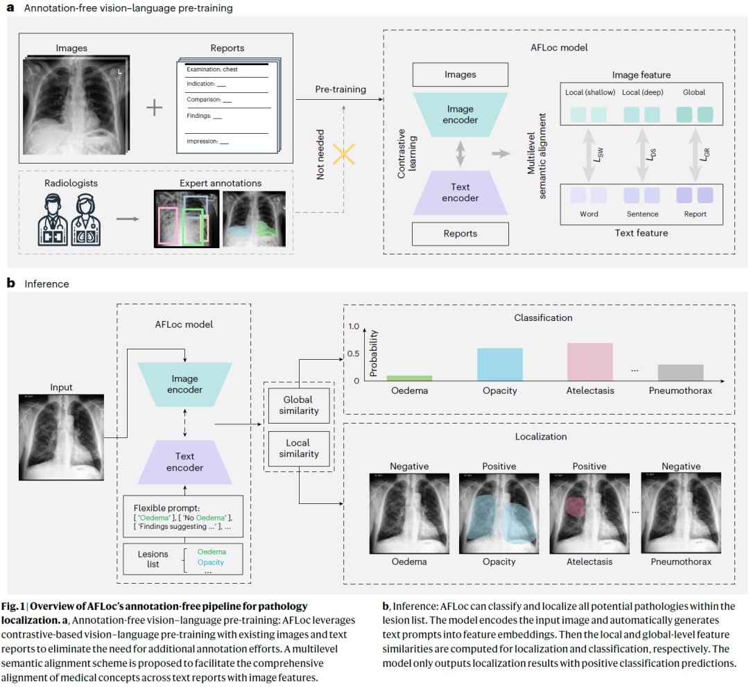 AFLoc 是一个基于对比学习的多模态视觉–语言模型。研究人员从医学影像中提取浅层局部特征、深层局部特征和全局特征,并从临床报告中提取词级、句级和报告级语义特征。通过多层级语义对齐机制,不同尺度的图像特征与不同粒度的文本语义被同时对齐学习。模型在预训练阶段仅使用影像–报告对,不需要任何病灶标注;在推理阶段,通过灵活的文本提示即可完成病理分类与对应区域的自动定位。