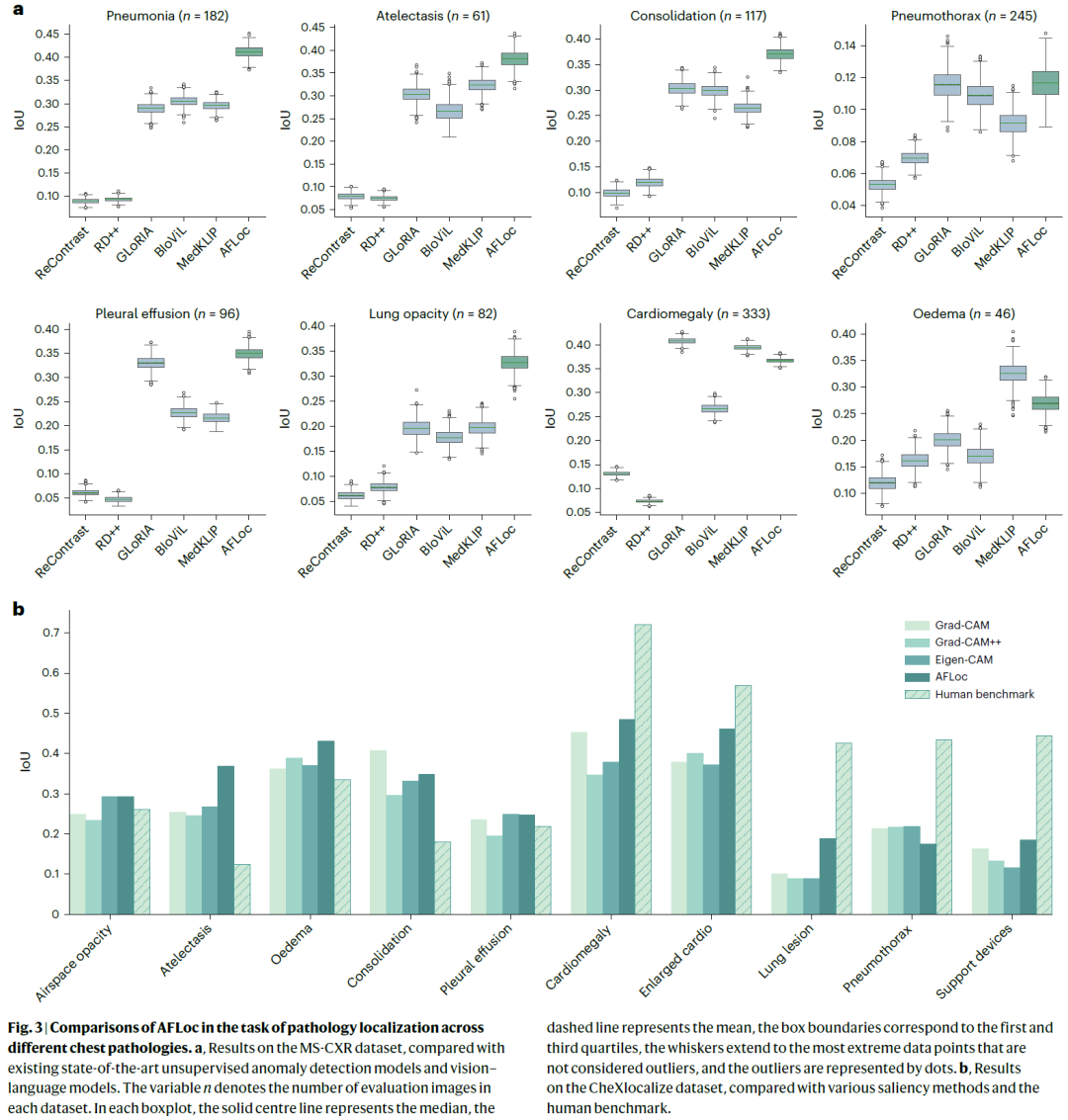 图 3|AFLoc 在不同胸部病理定位任务中的性能对比。