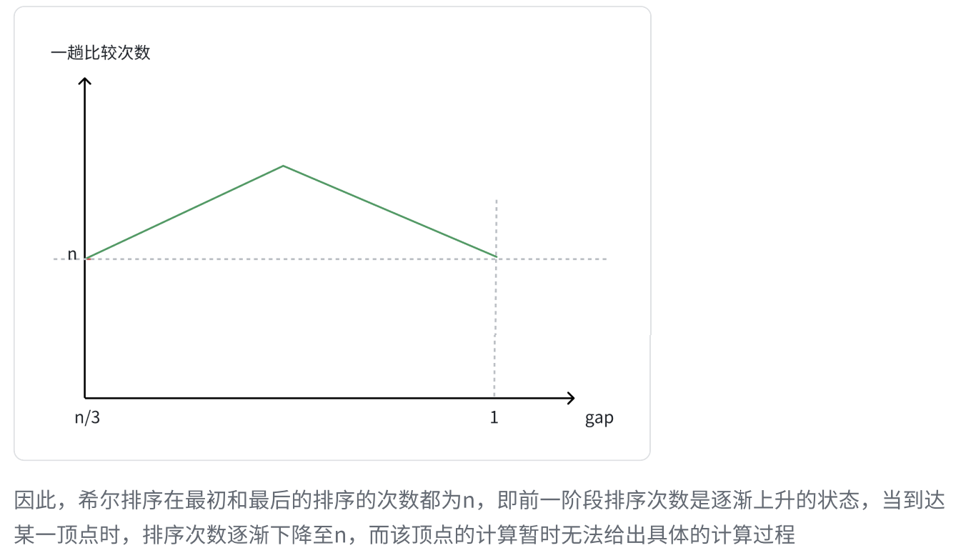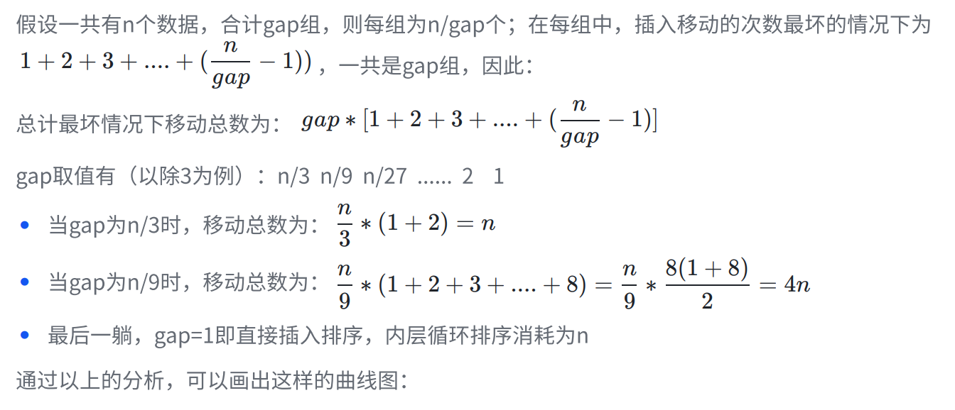 希尔排序时间复杂度不好计算,因为 gap 的取值很多,导致很难去计算,因此很多书中给出的希尔排序的时间复杂度都不固定。《数据结构(C语言版)》--- 严蔚敏书中给出的时间复杂度为: