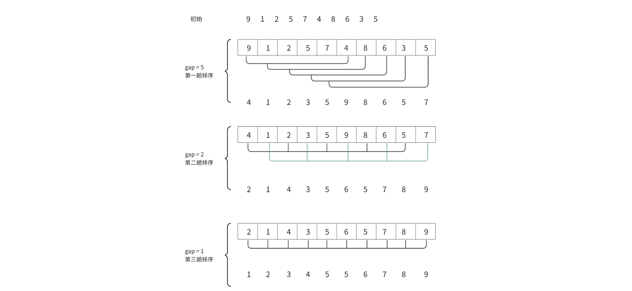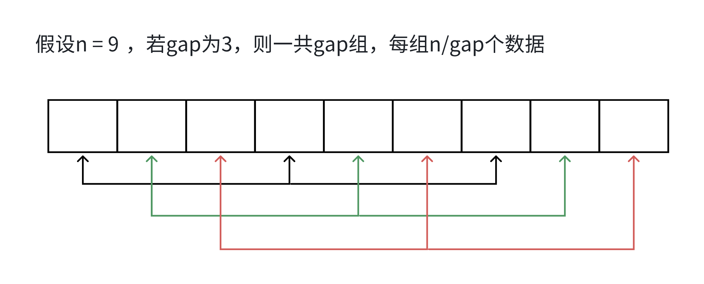 希尔排序法又称缩小增量法。希尔排序法的基本思想是:先选定一个整数(通常是gap = n / 3 + 1),把待排序文件所有记录分成各组,所有的距离相等的记录分在同一组内,并对每一组内的记录进行排序,然后gap = gap / 3 + 1得到下一个整数,再将数组分成各组,进行插入排序,当gap = 1时,就相当于直接插入排序。