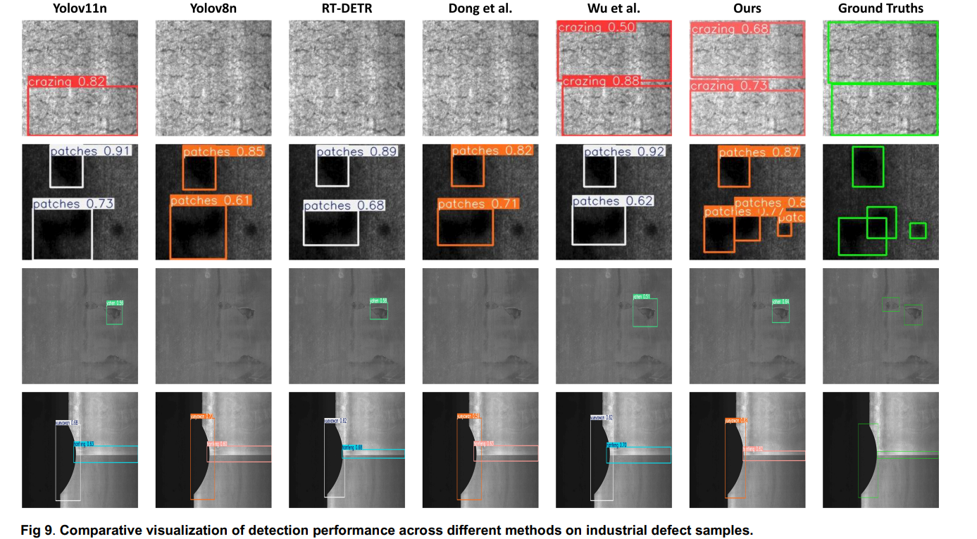 图9展示了一个全面的定性比较,展示了所提出的EFEN-YOLOv8架构在不同工业缺陷场景下的优越检测性能。可视化结果表明,虽然包括YOLOv11n、YOLOv8n、RT-DETR以及Dong等人和Wu等人的近期方法在内的竞争方法在不同缺陷类别上表现各异,但我们提出的方法始终提供稳健的检测并具有高置信度得分。