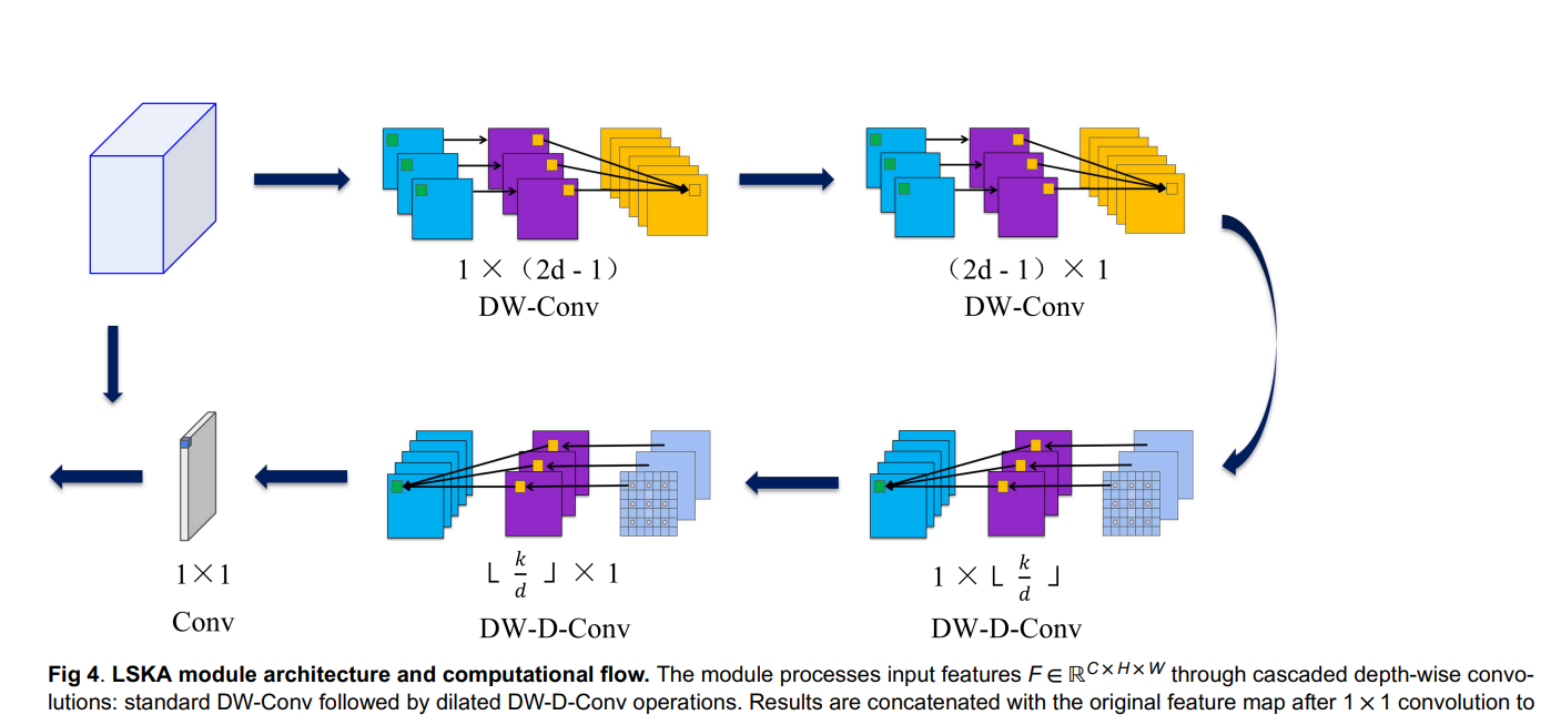 表面缺陷呈现出多方面的检测挑战,包括不规则的几何形状、不连续的边界和复杂的边缘伪影,这些问题通常与显著的背景噪声和成像干扰叠加在一起。这些条件严重阻碍了在复杂工业环境中准确定位缺陷。为了增强特征区分能力和改进缺陷表征,我们在最终预测层之前集成了大分离核注意力机制。这种策略性布局使得能够增强对关键缺陷特征的关注,同时保持计算效率。如图4所示,LSKA将传统的2D卷积核分解为级联的1D可分离操作,通过深度可分离卷积和空洞卷积路径顺序应用。这种分解策略显著降低了计算开销和内存需求,同时保留了捕获复杂缺陷模式中全局空间依赖关系所必需的大感受野能力。