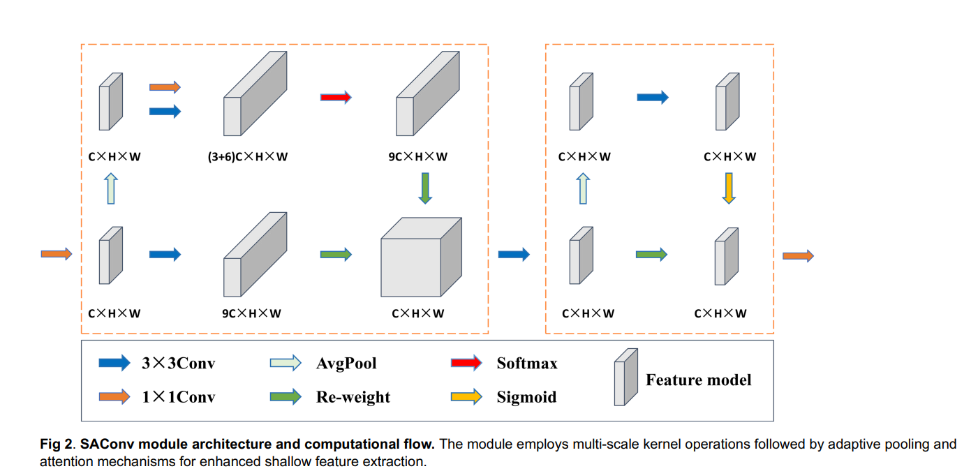 对于表面缺陷检测,浅层信息对于识别微小异常和细微纹理变化不可或缺。传统CNN由于有限的空间连接性和注意力机制不足,常常无法充分保留和提炼这些关键的浅层特征。为了解决这些局限性并增强浅层对缺陷的敏感性,我们引入了浅层注意力卷积模块。该模块专门设计用于增强细粒度特征表征,同时保持计算效率。SAConv的操作机制如图2所示。