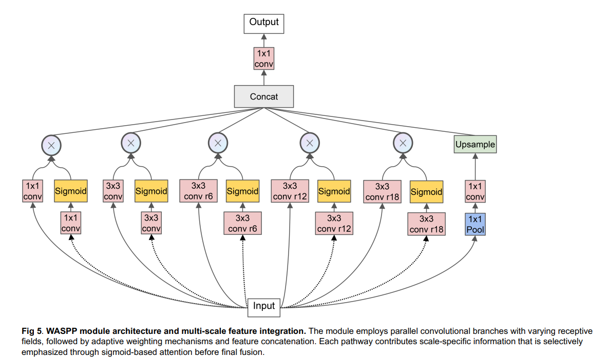 卷积操作具有固有的空间局部性约束,主要捕获有限感受野内的局部模式。尽管这种局部性支持有效的细粒度特征提取,但它从根本上限制了全面场景分析所必需的全局上下文建模和高级语义理解。多尺度卷积策略通过融合不同感受野配置来捕获跨空间尺度的分层语义信息,从而解决了这一局限。然而,从异构感受野提取的特征对特定检测任务具有不同的相关性,其中大部分可能与关键的判别模式无关。我们提出了加权空洞空间金字塔池化模块,作为传统ASPP架构的增强变体,如图5所示。WASPP集成了多个并行卷积通路,分别采用标准卷积核(1×1,3×3)和具有系统空洞率(6, 12, 18)的空洞卷积,以高效捕获多尺度上下文信息。这种分层设计能够同时提取局部细节和全局上下文,同时为实时应用保持计算上的易处理性。