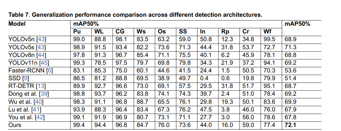 为了评估所提架构的泛化能力,我们在GC10-DET数据集上进行了性能评估,将其作为独立的验证基准。表7展示了泛化结果,我们的方法在多个缺陷类别上相比先进检测器表现出优越性能。特别值得注意的是,在冲孔缺陷上达到了99.4%的异常精度,为该类别设立了新的性能基准。