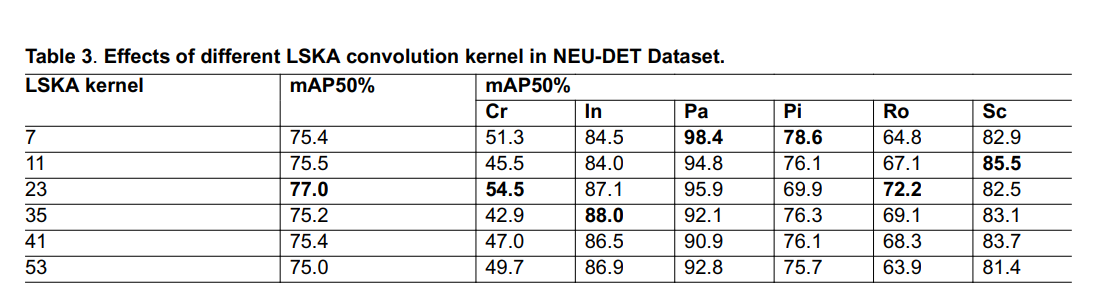 LSKA采用一种复杂的注意力机制,将传统的二维卷积核在深度卷积层内分解为沿水平和垂直轴级联的一维操作。我们评估了六种不同的核尺寸:7、11、23、35、41和53像素。考虑到两个数据集中表面缺陷的形态多样性,包括显著的尺度变化和异质的几何模式(如细长形、三角形和半圆形),核尺寸的选择对检测性能至关重要。