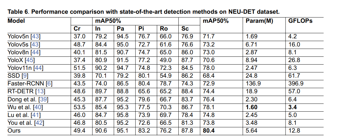 与资源密集型架构相比,计算效率分析显示出有利的权衡。相对于Faster R-CNN,我们的模型显著降低了计算需求,同时实现了更高的检测精度。同样,与SSD和RT-DETR相比,我们的架构以显著更低的参数量开销和计算复杂度提供了更高的精度。虽然Wu等人[40]等轻量级方法实现了更高的参数效率,但我们的方法在检测性能上大幅超越它们2.3个百分点,证明了适度的计算开销是合理的。我们的方法在需要细粒度特征区分的挑战性缺陷类别上表现出特别强的性能,确立了其在检测精度至关重要的工业表面检测应用中的有效性。