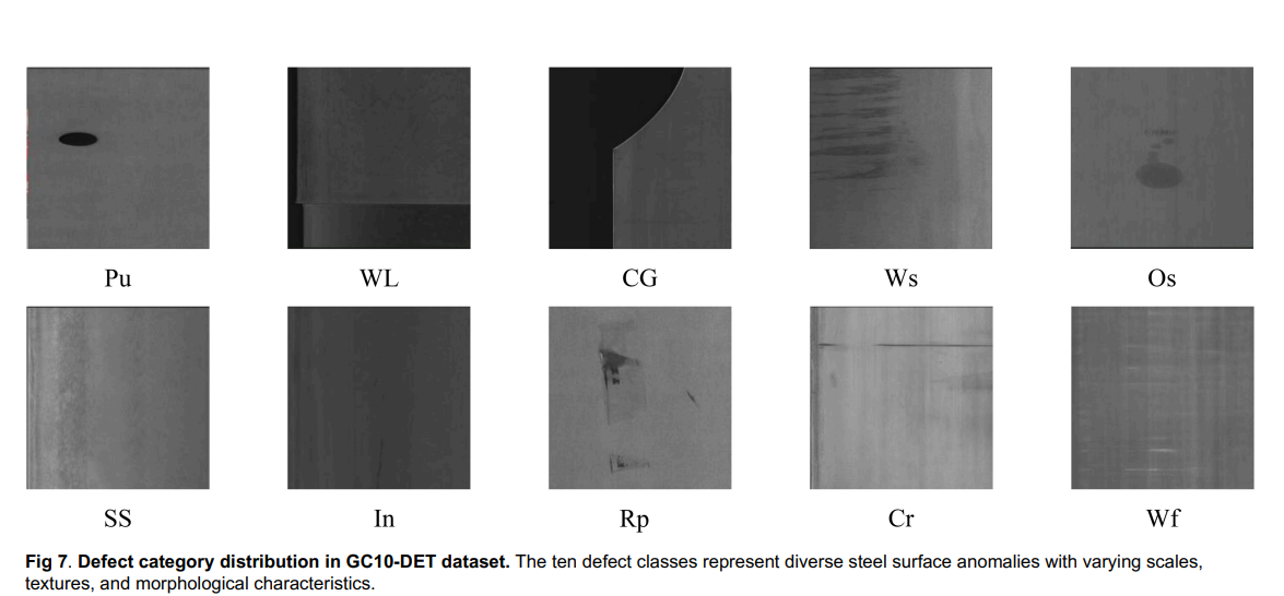 GC10-DET数据集。 GC10-DET数据集包含2294张高分辨率图像,尺寸为2048×1000像素,涵盖十种不同的钢材表面缺陷类别,如图7所示。缺陷分类包括:冲孔、焊缝线、月牙弯、水渍、油渍、丝斑、夹杂、轧制凹坑、折痕和腰折。该数据集通过更高分辨率的图像和更多的缺陷类别提供了更高的复杂性,能够全面评估模型在不同工业表面条件下的泛化能力。