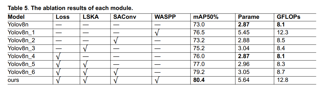 为了验证所提架构增强的有效性,我们以YOLOv8n为基线框架进行了全面的消融实验。表5展示了在NEU-DET数据集上每种模块配置的消融结果。消融结果显示了每个架构组件的独特性能特征。最初,虽然WASPP模块(YOLOv8n_1)引入了显著的参数量开销和计算复杂度,但它实现了显著的检测改进,达到了76.5% mAP,而基线为73.0%。单独的SAConv模块(YOLOv8n_2)表现出最小的性能提升,仅实现了边际改进且参数量增加可忽略不计。这种有限的效果表明SAConv需要与上下文注意力机制协同整合才能充分发挥其潜力。LSKA注意力机制(YOLOv8n_3)展现出显著的独立有效性,以最小的计算开销达到了75.2% mAP。这2.2%的改进验证了LSKA增强上下文特征关系并将模型注意力导向关键缺陷特征的能力。𝛽-FEIoU损失函数(YOLOv8n_4)显著提高了回归性能,达到76.0% mAP,同时保持了与基线相同的参数量和计算复杂度,证实了我们自适应损失公式的有效性。逐步集成模块揭示了引人注目的协同效应。将𝛽-FEIoU与LSKA结合(YOLOv8n_5)产生了77.0% mAP,表明增强的损失优化有助于提高注意力机制的性能。加入SAConv(YOLOv8n_6)带来了显著的改进,达到79.2% mAP,验证了我们的假设,即SAConv的有效性依赖于LSKA提供的充分上下文交互。这种配置使SAConv能够有效提取浅层特征、丰富空间信息并强调多尺度感受野的重要性。