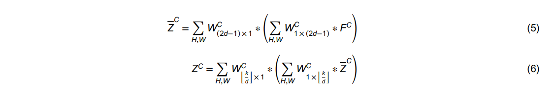 其中 * 和 ⊗ 分别表示卷积和逐元素乘法操作。中间特征 Z'_C 表示具有 (2d−1) × (2d−1) 核尺寸的深度可分离卷积输出,捕获局部空间关系的同时缓解了空洞操作固有的网格伪影。空洞卷积采用核尺寸 ⌊k/d⌋ × ⌊k/d⌋,其中 ⌊·⌋ 表示向下取整函数。注意力图 A_c 由 1×1 卷积产生,用于通道特征重新校准。通过这种分层处理,空洞深度可分离卷积从局部特征 Z'_C 中提取全局空间上下文,同时通过可分离核分解保持计算效率。