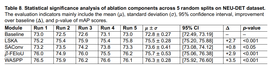 消融实验的鲁棒性分析。 为了严格评估每个提出模块的功效,我们进行了全面的统计显著性检验。这包括在NEU-DET数据集上使用9:1训练-测试划分进行的五次独立实验,每次实验使用不同的随机种子初始化。表8展示了详细的统计分析,包括平均性能、标准差、95%置信区间以及将每个模块贡献与基线YOLOv8n进行比较的配对t检验结果。