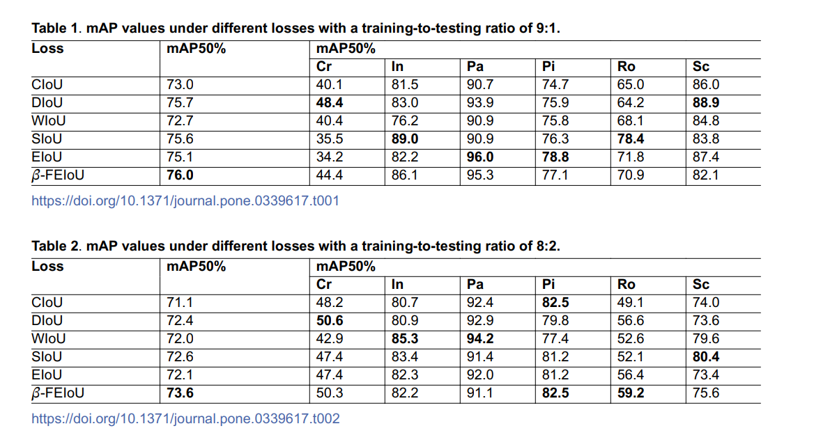 𝛽-FEIoU的有效性源于EIoU回归损失与Focal损失分类的协同整合,并通过我们自适应的𝛽加权机制得到增强。Focal损失分量有效处理了背景与缺陷区域之间的类别不平衡,而𝛽参数能够基于检测难度和类间关系进行动态调整。这种双重机制加速了收敛,同时增强了对细微缺陷变化的区分能力。通过对不同缺陷类别和数据划分场景的全面评估,𝛽-FEIoU在工业表面缺陷检测应用中始终表现出优越的平衡性能和卓越的鲁棒性。