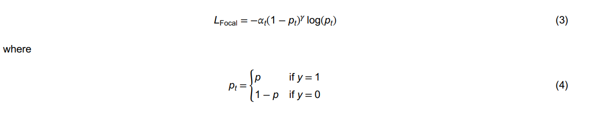Focal损失分量通过基于分类难度动态重加权训练样本,解决了缺陷检测中普遍存在的前景-背景不平衡问题。该机制减少了易分类样本的影响,同时强调困难负样本,有效缓解了单阶段检测框架特有的正负样本失衡问题。Focal损失公式见公式(3):