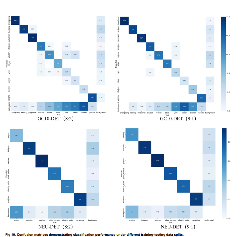 混淆矩阵分析与性能见解。 图10展示了不同训练-测试比例下的混淆矩阵,为模型在缺陷类别上的分类能力和性能特征提供了全面的见解。在GC10-DET数据集上,提出的EFEN-YOLOv8表现出异常的分类性能,大多数类别的对角线值超过0.70。特别值得注意的是焊封、月牙弯和水斑缺陷,它们表现出优越的检测精度。这种高精度性能表明增强架构内在的有效特征提取和区分能力。同样,在NEU-DET数据集上,包括夹杂、斑块和划痕在内的类别保持了高于0.90的稳健检测精度,验证了模型在不同工业场景下的有效性。