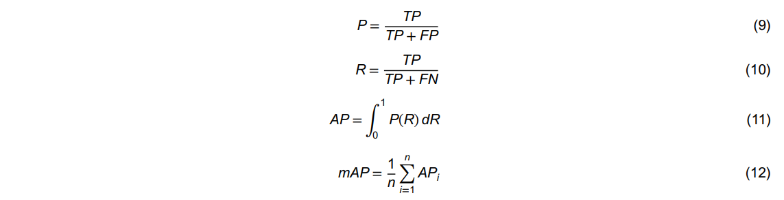 其中,TP代表真正例检测,FP表示假正例预测,FN表示假反例(漏检),n对应缺陷类别的总数。平均精度计算为每个类别的精确率-召回率曲线下面积,而平均精度均值表示所有类别的AP平均值。对于单类别场景,mAP简化为AP。