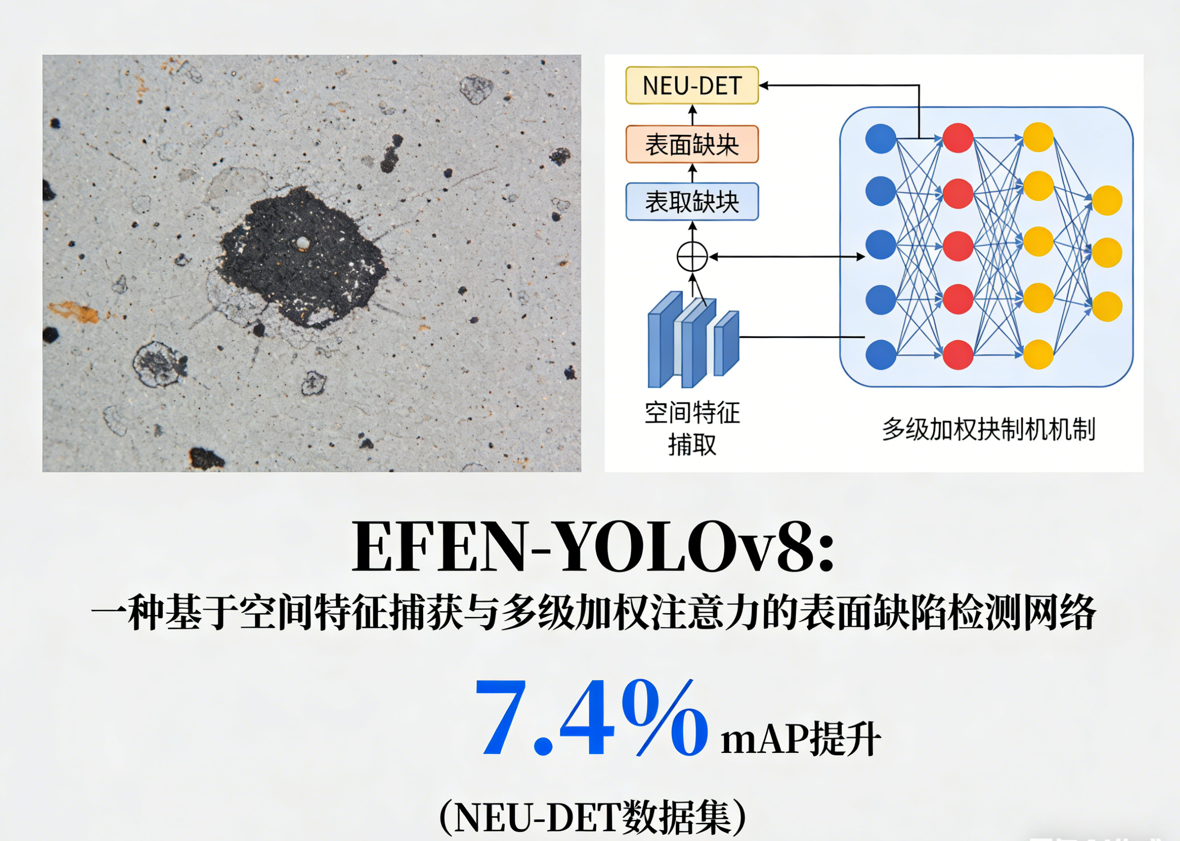 摘要:工业环境中的表面缺陷严重影响着产品的外观、质量及生产效率。尽管深度学习方法展现出良好前景,但现有架构在工业场景中的特征提取能力往往不足。本文提出EFEN-YOLOv8——一种注重高效特征提取以提升检测精度的新型缺陷检测框架。该方法引入了𝛽-FEIoU损失函数,可同时处理缺陷-背景区分与正负样本不平衡问题。其中,浅层注意力卷积模块增强了网络早期层的特征定位能力,而大分离核注意力模块则通过扩大感受野来提升处理效率。此外,加权的多孔空间金字塔池化特征融合模块促进了多尺度特征融合,使模型能捕获更丰富的抽象信息并提升表征能力。全面的实验验证(包括对不同数据划分进行统计显著性检验)表明,本方法性能优于现有方案。相较于基线模型,我们的框架在NEU-DET数据集上实现了7.4%的mAP提升,在GC10-DET数据集上取得了3.3%的性能增强,且在8:2和9:1两种训练-测试配置下均保持稳定的性能表现。这些结果验证了该方法具备强大的泛化能力,并确立了其在工业表面缺陷检测应用中的有效性。