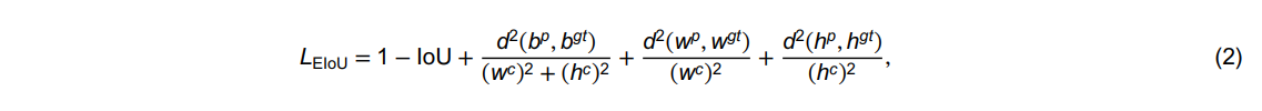 EIoU 损失函数 [35] 如公式(2)所示,并通过全面的几何惩罚项增强了边界框回归(如图3所示)。
