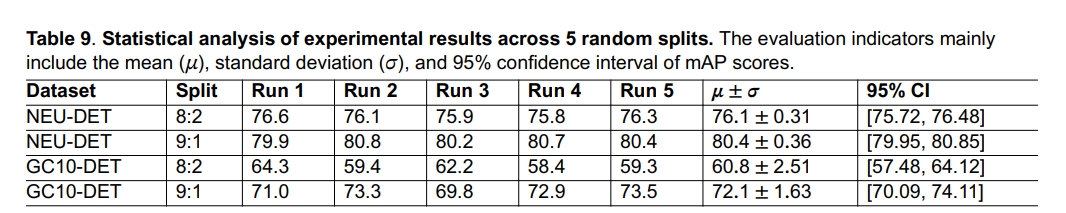 模型性能的鲁棒性分析。 为确保实验的鲁棒性和统计可靠性,我们采用了严格的验证框架。具体来说,我们在NEU-DET和GC10-DET两个数据集上进行了五次独立实验,每次使用不同的随机种子初始化,并在两种训练/测试比例(8:2和9:1)下进行评估。关键是,每次迭代都进行数据集打乱,以确保训练和测试划分之间的统计独立性。表9展示了这五折实验验证的详细结果,包括mAP得分的均值、标准差和95%置信区间。我们的统计分析突出了不同配置和数据集之间的显著性能差异。值得注意的是,将训练数据比例从80%增加到90%在两个数据集上均带来了一致的显著改进:NEU-DET记录了4.3个百分点的提升(从76.1%到80.4%),而GC10-DET则表现出更明显的11.3个百分点的提升(从60.8%到72.1%)。这些增益明确表明,我们提出的架构显著受益于更大的训练集,特别是对于具有复杂缺陷模式的挑战性数据集。