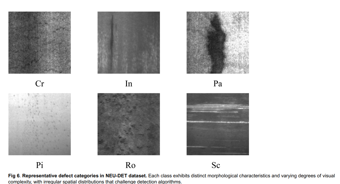 NEU-DET数据集。 NEU-DET数据集由中国东北大学开发,其挑战性在于存在显著噪声、光照不均、缺陷形态多样以及类内差异大等特点,使其特别适合验证鲁棒的检测算法。该数据集包含六类表面缺陷共1800张图像,每类300个样本,分辨率为200×200像素,如图6所示。缺陷类别包括:裂纹、点蚀、氧化皮、划痕、夹杂和斑块。如图6中的代表性样本所示,每个缺陷类别都表现出独特的形态特征,具有不规则的空间分布和不同的视觉复杂度。值得注意的是,裂纹样本显示出显著的背景噪声和不均匀光照,这些因素可能掩盖关键的缺陷边界,导致漏检和特征学习受损,最终挑战模型的鲁棒性和检测精度。