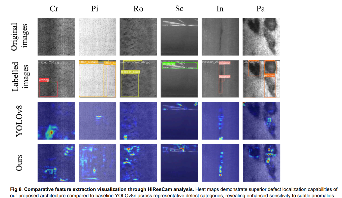包含所有提出组件的完整架构达到了80.4% mAP,相比基线YOLOv8n有显著的7.4%提升。虽然这种配置增加了计算成本,但对于需要高精度的工业缺陷检测应用来说,显著的性能提升证明了计算开销的合理性。系统的消融研究验证了每个组件的贡献,并展示了集成架构增强的协同效益。为了全面评估特征提取能力,我们采用HiResCam可视化方法将我们的增强架构与基线实现进行比较,如图8所示。对比分析揭示了在不同缺陷类别上的优越特征提取性能。对于裂纹缺陷,虽然图像中只有单个缺陷被明确标注,但存在多个未标记的异常。我们的模型成功地识别了多个未标注的实例,显示出对细微缺陷模式增强的敏感性。同样,对于具有广泛空间分布特征的点蚀缺陷,基线模型表现出不足的特征学习能力,而我们的架构则展示了全面的缺陷提取能力。在所有缺陷类别上的一致改进验证了我们模型增强的特征提取效能,并证实了架构增强的有效性。