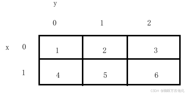 1.for循环遍历 当搞清楚二维数组的内存分布后,遍历起来就方便了(依然可以理解为 x 表示行,y表示列)