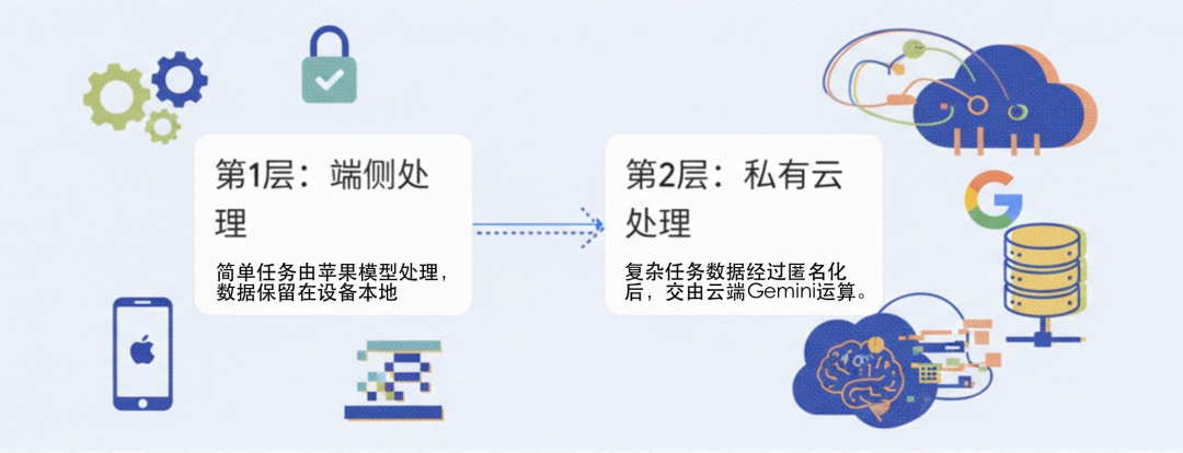 第一招是“分层处理”架构:如同家中琐事自己做主,棘手难题再找帮手。设闹钟、查天气等轻量任务,由苹果自研的 30 亿参数端侧模型承接,数据全程留在设备本地,既无延迟又保安全;PDF 总结、行程规划等复杂任务,经加密后传输至苹果私有云,再交由 Gemini 运算。