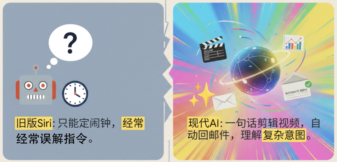 这也是迫不得已。当隔壁的安卓阵营已经靠着大模型实现了“一句话剪视频”、“自动回邮件”时,千年不变的 Siri 似乎还停留在“帮我定个五分钟后的闹钟”这种小学生水平。