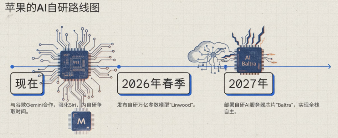 据公开规划,苹果自研万亿参数模型(代号“Linwood”)将于2026年春季亮相,较原计划提前一年;自研 AI 服务器芯片 Baltra 也在加速推进,预计 2027 年完成数据中心部署。届时,苹果将逐步用自研模型替代 Gemini,实现从“技术借力”到“全栈自主”的华丽转型。