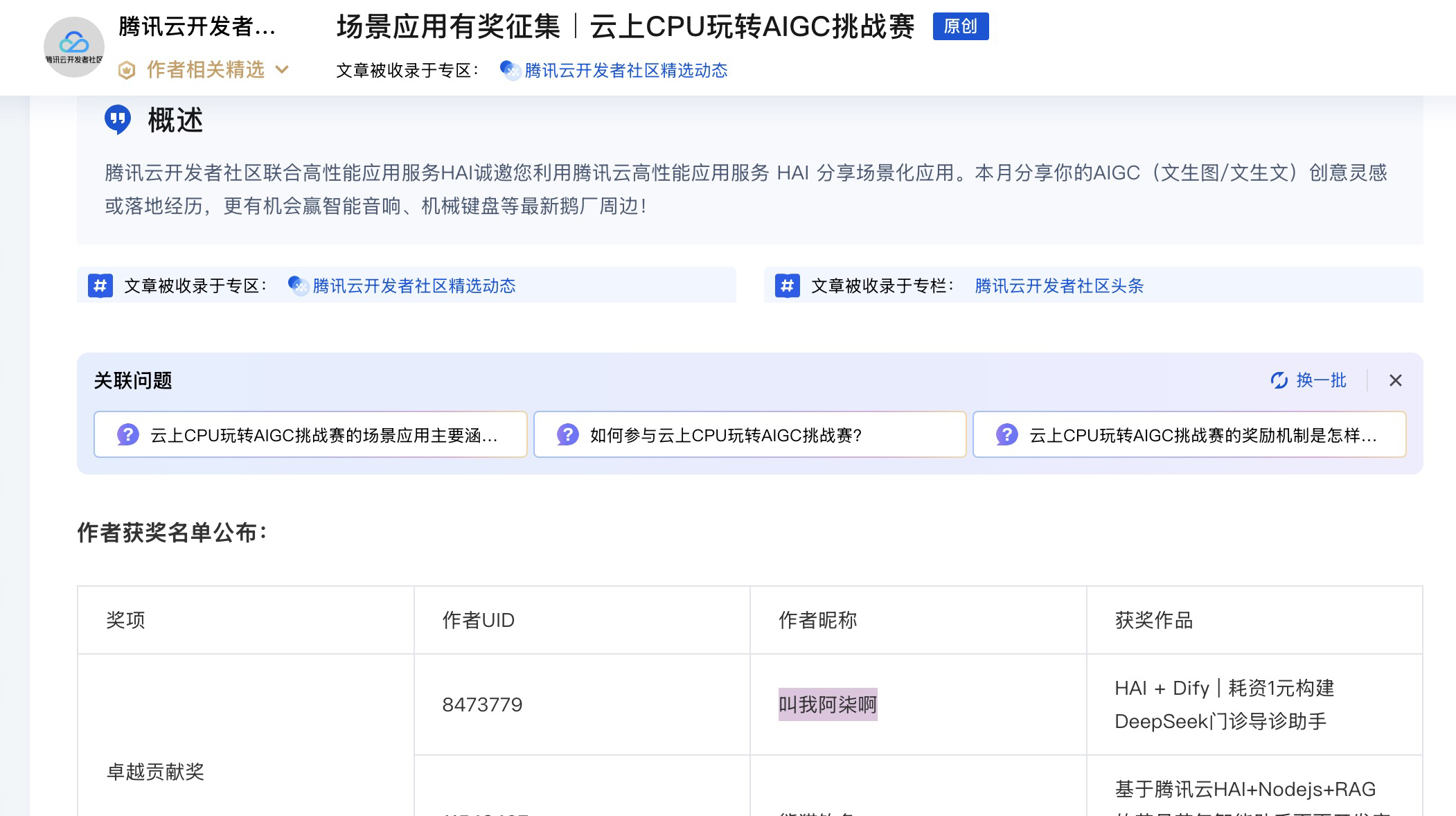 2025年参加了不少社区的征文活动,在征文活动中不仅接触学习了很多AI知识。例如《CPU玩转AIGC挑战赛》,这也是以第一次接触腾讯云讯云高性能应用服务HAI-CPU的产品。那时候正好自己在研究Dify智能体平台,正好结合HAI提供了大模型能力,完成了一个智能体的开发。